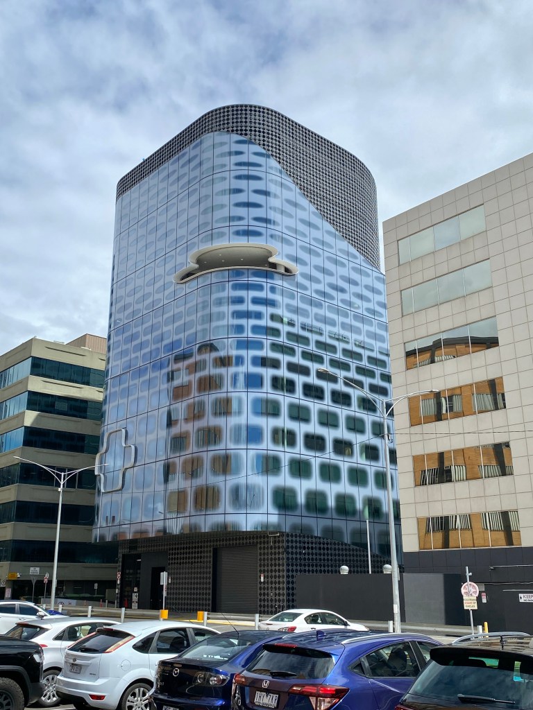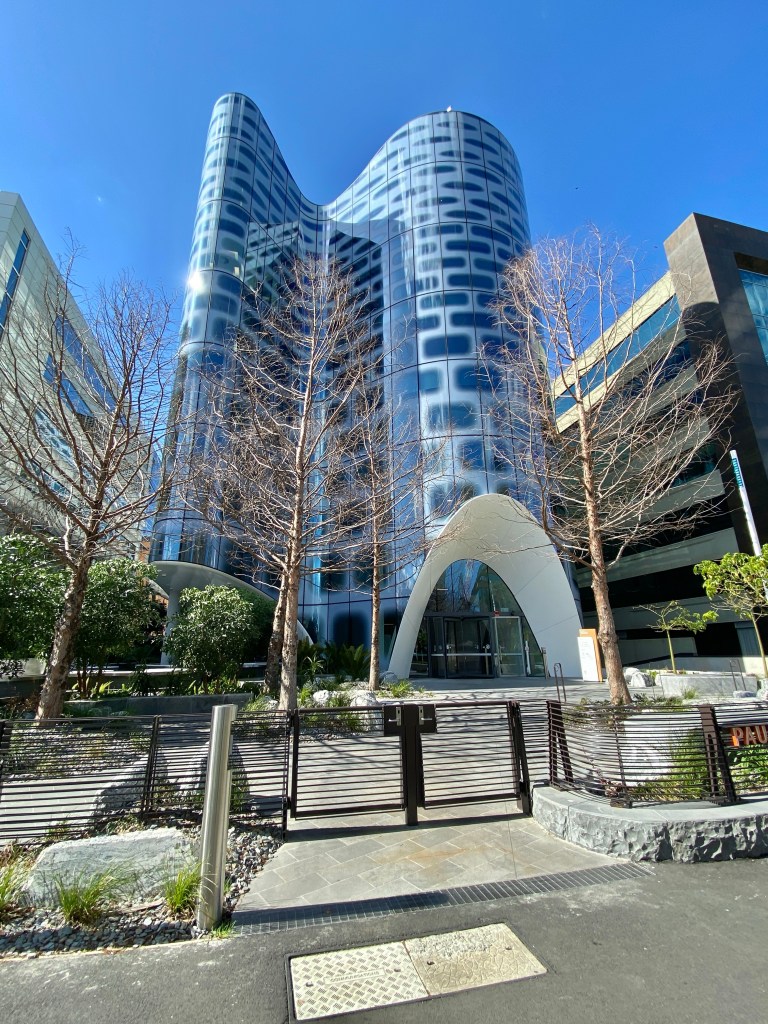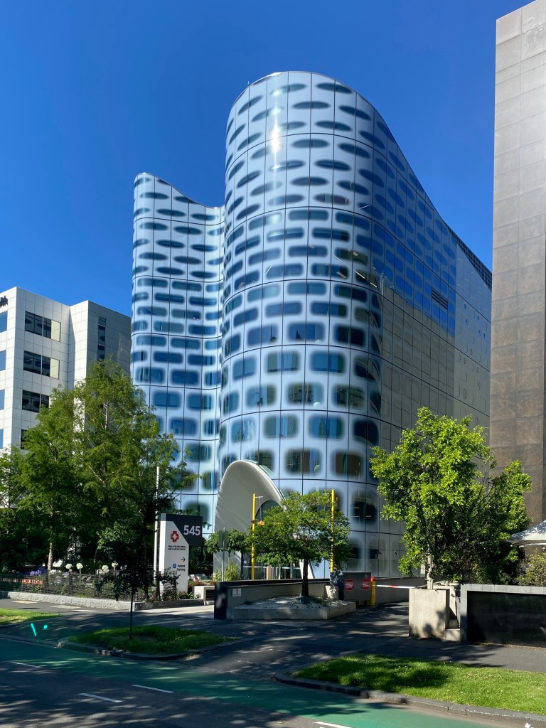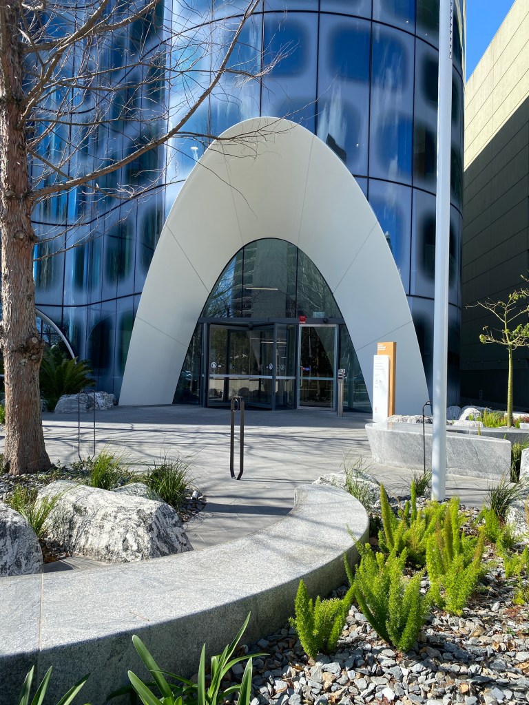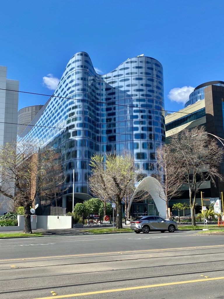 The Paula Fox Melanoma and Cancer Centre on St Kilda Road is pretty striking, all curves where all around it are square. Opening in April this year, it was designed by @lyonsarchitecture, another version of their restless, dynamic forms and facades. This one is wiggly at the front, top and bottom, with an arched entrance leaning out, and an undercut bit that opens to a seating area (pic 9 from Lyons website). The facades are fritted (white dots) creating rounded shapes, derived from a skin cross section, though it didn’t come out as strongly as the renders (pic 10). I particularly liked the landscaping by @rush.wright.associates, lots of granite (I think) both polished and rough, and some quite mature trees trucked in. It has a low fence, unusual for St Kilda Road, maybe to keep the rough sleepers out ? (but I just jumped it). Interiors sent by a friend, also curvy. It’s part of the Alfred, but also separate, and designed to assist treatment recovery and research, without looking like a hospital. Last pic is Paula Fox at the opening.