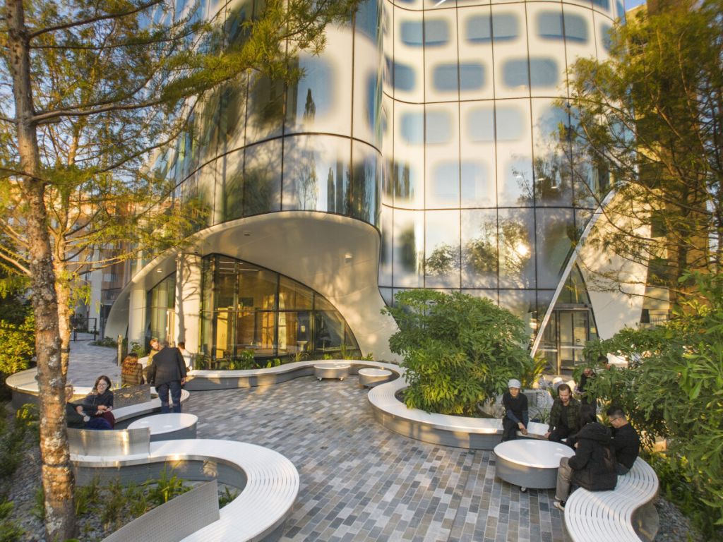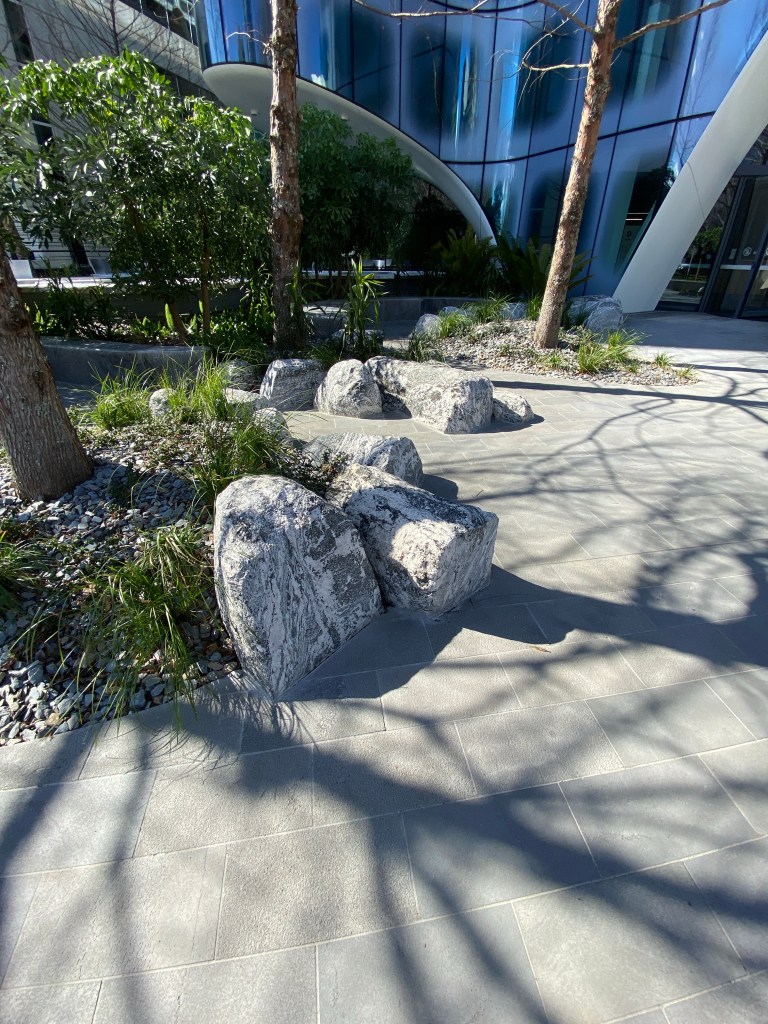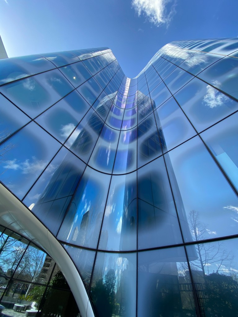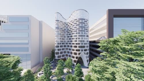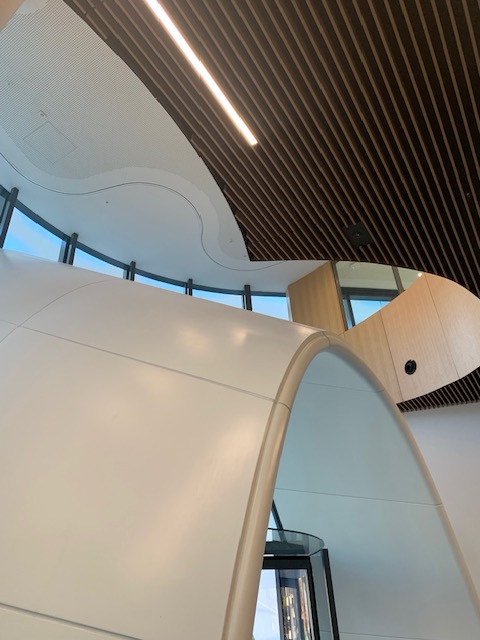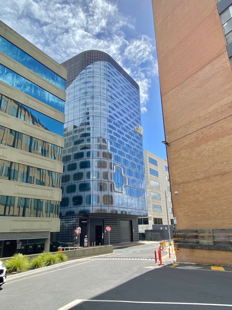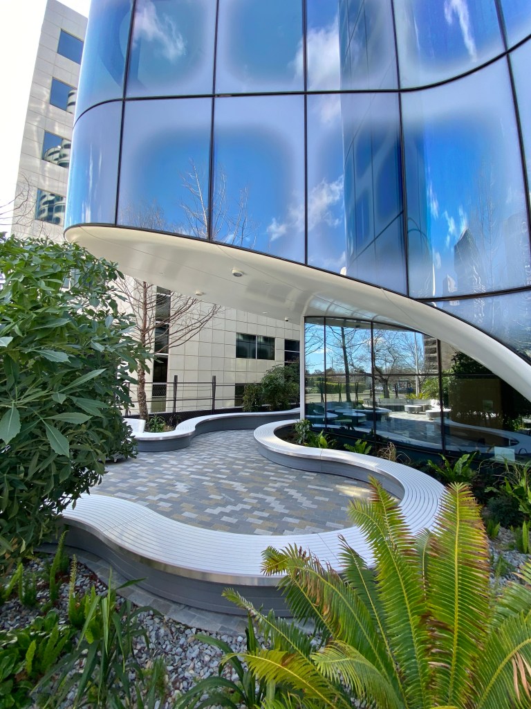 The Paula Fox Melanoma and Cancer Centre on St Kilda Road is pretty striking, all curves where all around it are square. Opening in April this year, it was designed by @lyonsarchitecture, another version of their restless, dynamic forms and facades. This one is wiggly at the front, top and bottom, with an arched entrance leaning out, and an undercut bit that opens to a seating area (pic 9 from Lyons website). The facades are fritted (white dots) creating rounded shapes, derived from a skin cross section, though it didn’t come out as strongly as the renders (pic 10). I particularly liked the landscaping by @rush.wright.associates, lots of granite (I think) both polished and rough, and some quite mature trees trucked in. It has a low fence, unusual for St Kilda Road, maybe to keep the rough sleepers out ? (but I just jumped it). Interiors sent by a friend, also curvy. It’s part of the Alfred, but also separate, and designed to assist treatment recovery and research, without looking like a hospital. Last pic is Paula Fox at the opening.