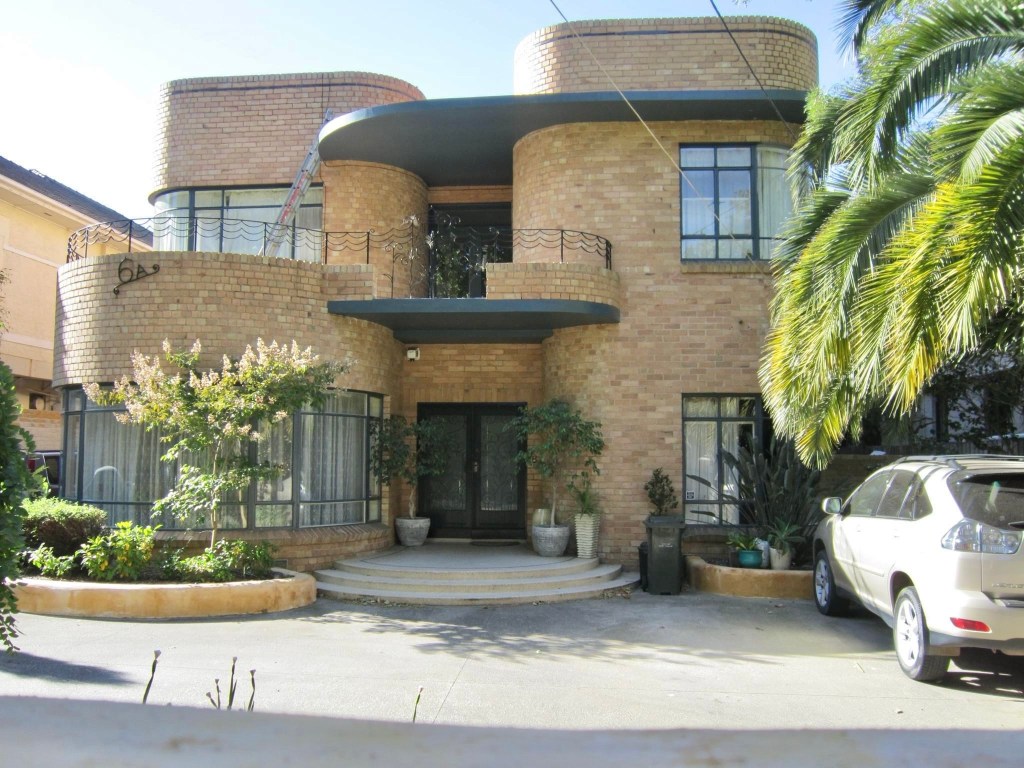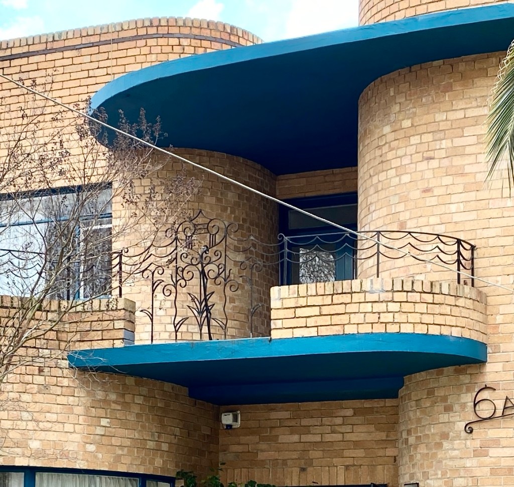 Fabulous curvalicious late late streamlined Art Deco house at 6A Dickens Street, Elwood. It was built in 1954 for Mr & Mrs Rubenstein, who were apparently quite active in the local Jewish community. The architect was Leslie J Reed, who had designed in all the revival styles and Deco before WW2, and here seems to have maybe pulled out a design from c1940, complete with wildly curly-wurly wrought iron. He did a very nice house nearby in Brighton Road (last pic) in 1937 that has some curves too. An FB contact sent me a good pic from 2010, when it had fewer cars in the front yard. The conc had just been painted a jaunty nautical blue. It’s no. 6A because it was built in the side yard of the 1935 Spanishy house to the left, which had replaced a Victorian house.