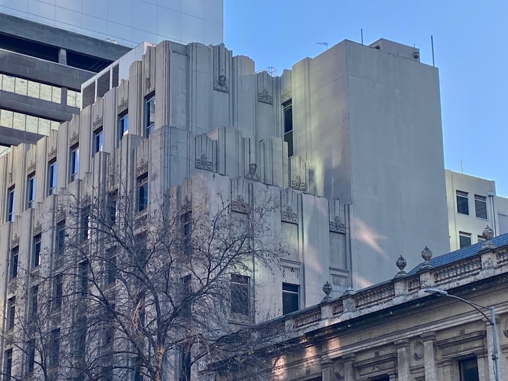 Hmmm another facadism job, as well as plonking the tower very close to the existing top floor. Doesn’t look too bad at first glance, but it’s not even symmetrical with the retained bits. It’s in Lonsdale Street next to the old Titles Office on Queen Street. Originally housing the State Taxation Office back when the states levied income tax, it was initially a five floor Neoclassical (or US Beaux Arts style) design by Oakley & Parkes completed in 1930, with allowance for five more, very handsome. Then in 1941-2 three floors were added, designed by govt architect Percy Everett, and he always liked to make a mark so he did it Art Deco setback skyscraper style, with decorative panels matching the original, nice. It’s been empty for some time, required upgrading, but this is quite a leap. It’s got a big back section, very plain, that could go, but they say the low 3.5m floor levels mean they have to demolish the lot, keeping only the very front facades, with different floor levels that don’t quite line up with the windows, grr. The tower is only setback the minimum 5m from the street, so only 1.5m from the top facade, too squeezy. Not sure if anything much inside, though I can see a nice stair in one corner. If they kept to at least the minimum 10m retention, and setback the tower the same, it wouldn’t squash the existing so much. Wouldn’t matter if it was taller. And why not keep the floor levels ? Just expose the services a bit. The whole thing seems to be max space efficiency, rather than doing the right thing. Architects @johnwardlearchitects. It’s a state government dep proposal for private leasing, and will be decided by the Minister for Planning, double hmmm. Anyone can object, but they don’t make it easy, the app no is PA2403006, just send the minister an email ! And cc city of Melb.