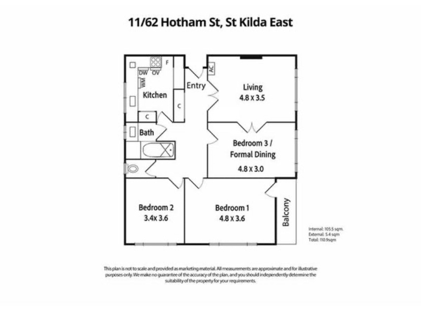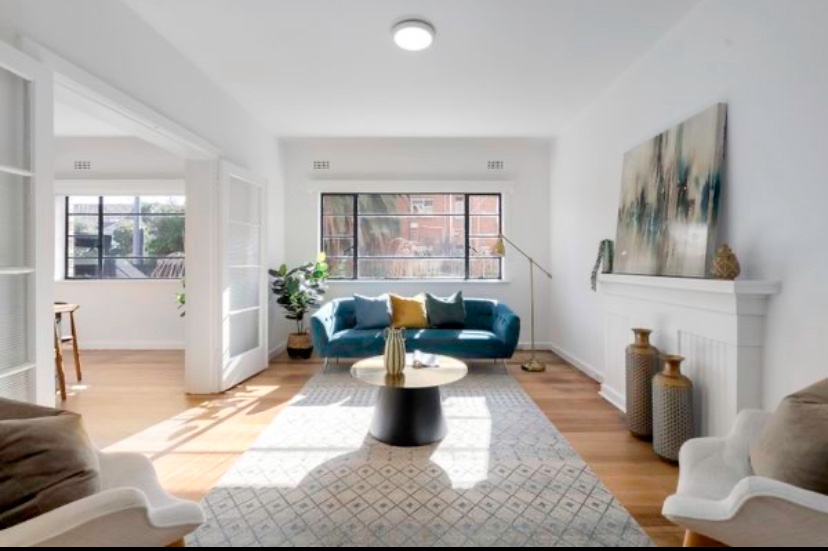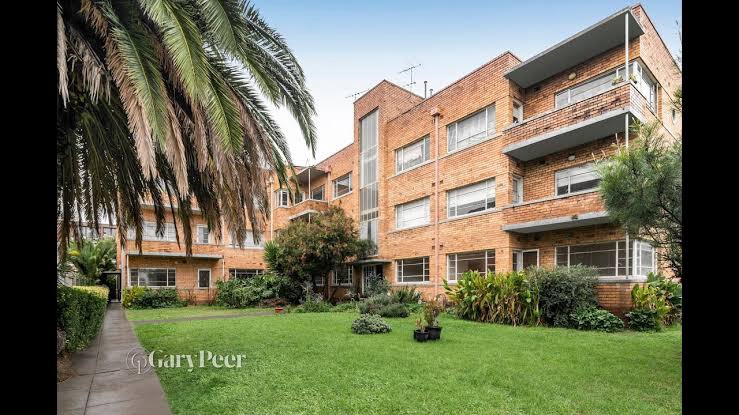 Some striking flats I’ve passed a million times in Hotham Street, East St Kilda. A bit of 1920s European modern as practiced by Jewish emigre architect Mordecai Benshemesh in the early postwar period (he’s best known for Edgewater Towers). Called the Francelaw Flats, they were designed 1948, but not completed till 1951, and feature his then trademark blocky cream brick volumes, with horizontal lines, porthole windows and sticky-out balconies (the front ones are actually a bit wonky, I wouldn’t be surprised if the posts were added later). Quite spacious layouts, and of course it has that great generous garden area, neither of which you get any more, partly/mostly because of profits and carparking (there’s about 6 spaces out back for 12 flats). Designed for Jewish clients, and many early residents were Jewish too. The block was refreshed just last year by @rowestudio_ , so no original kitchens or bathrooms now, but they kept the doors and fireplaces. The top floor flats each get a part of the flat roof. They must have also added that annoying porch that got in the way of my photos, on a rather stormy day. Last two pics and plan and inside from real estate site.