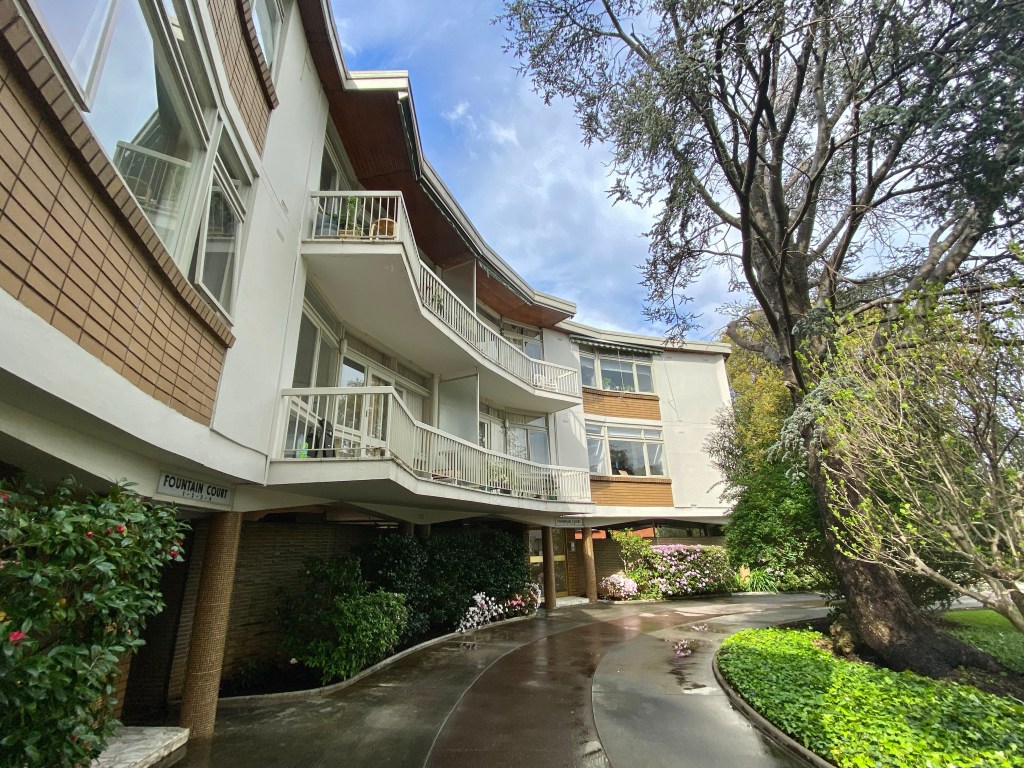 Fountain Court in Orrong Crescent was built in 1968, and designed by the very creative husband & wife team on Holgar & Holgar, part of the WW2 era Eastern European and often Jewish migrant community. Their houses are pretty sumptuous and glam, so this block is restrained by comparison.