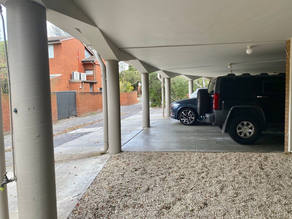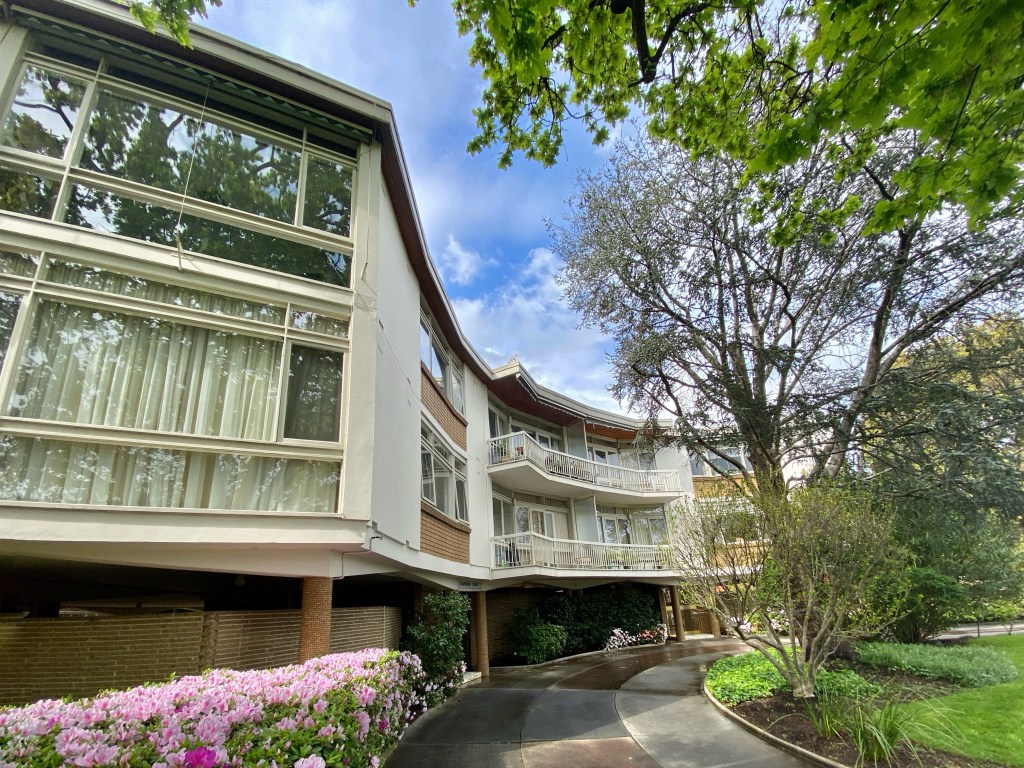 In fact it’s a bit clunky, with the curve made up of straight walls, and rather convoluted floor plans, but it’s full of interest with big windows, tiled columns, angled beams, textured concrete block screen walls, and gold anodised aluminium front doors and stair railings. Apparently it originally had a fountain out front, now it’s trees and azaleas, very nice. Tandem parking underneath, accessed from a side lane. Spacious inside, with two and three bedroom units, with big kitchens.
