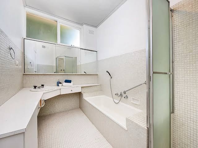 The client was Jewish emigre, and so were some of the first buyers. It was so unusual it got a spread in the Herald and the Age, and it certainly must have stood out in a street that was just bungalows. At least one flat has what might be original cabinetry, and an original bathroom, but sadly no gold taps.