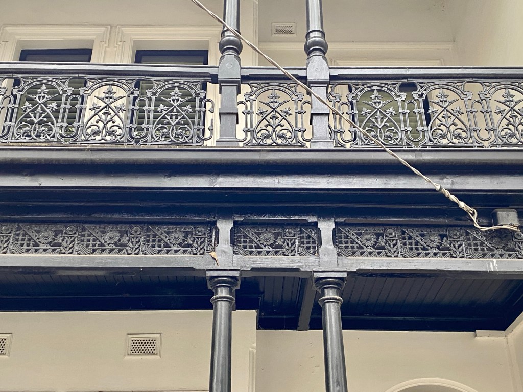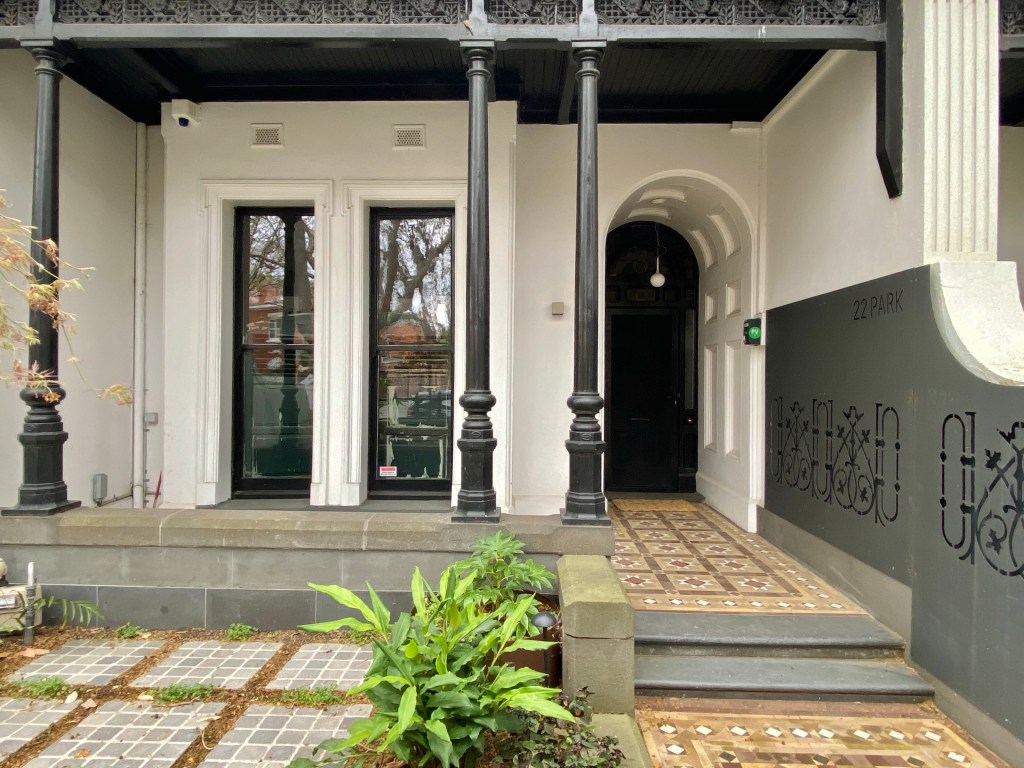 Very unusual terrace pair in Park Street West St Kilda; must be c1890, in advanced Queen Anne style, with curly pediment thing, red brick fence with cast iron in imitation of turned timber, as are the lower verandah posts, and a sunflower motif in the frieze. The doors are inset behind deep barrel vaults, never seen that before. The fashionable black paint means you can’t see much of the doors. The plan is also unusual, with the stairs set behind the two front rooms, in its own little section where normally there be another room, and the dining room has rounded corners, nice.