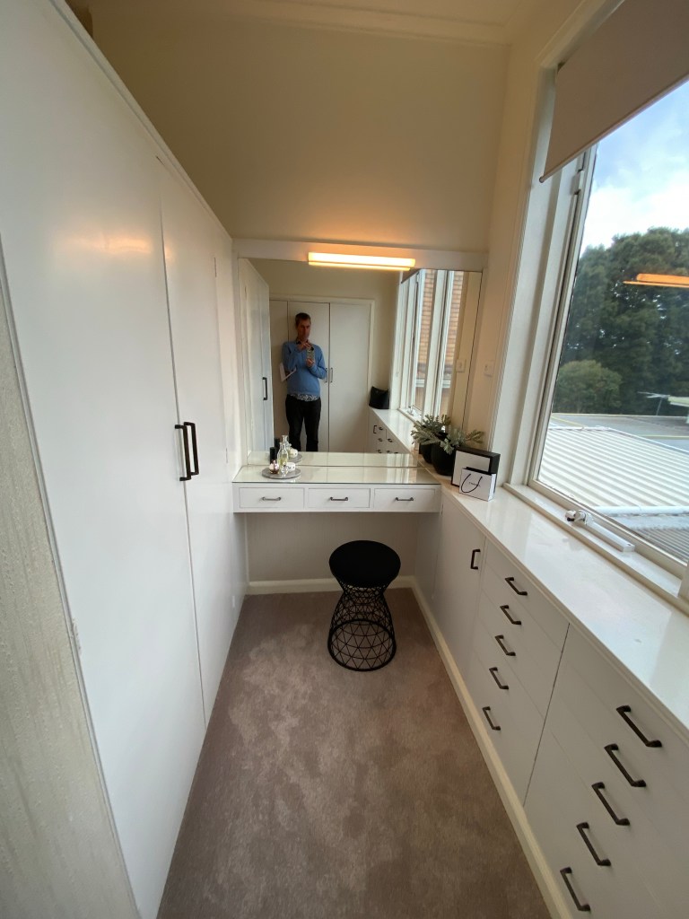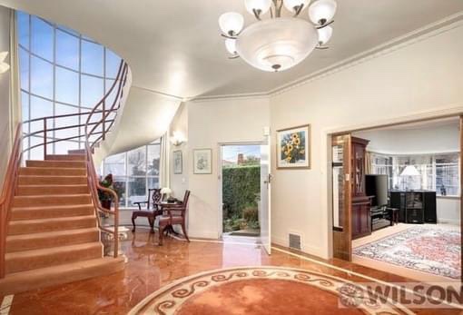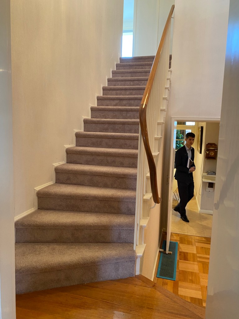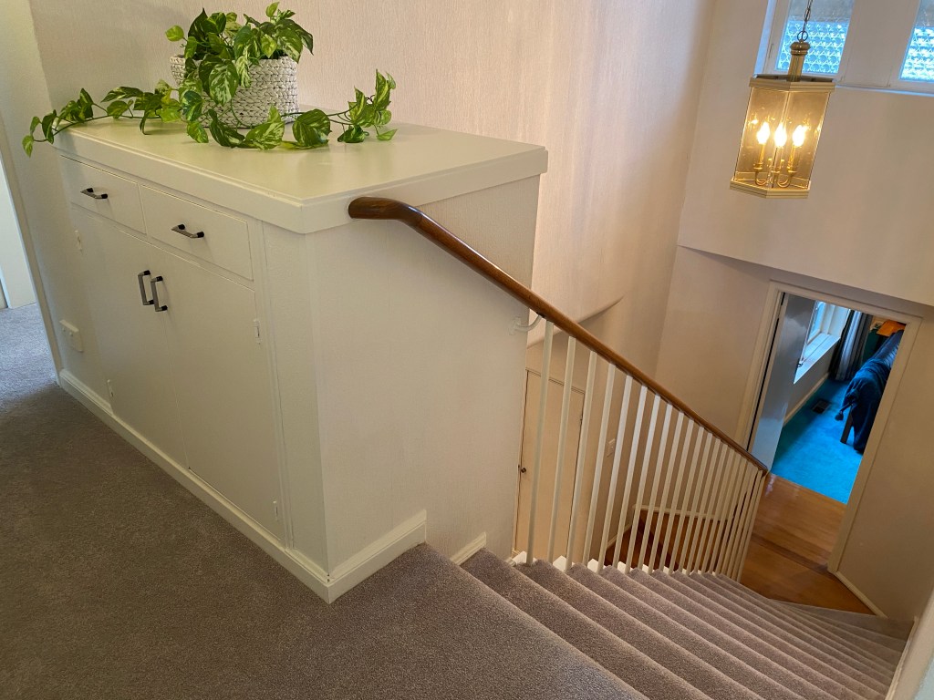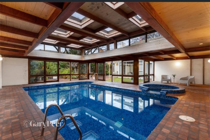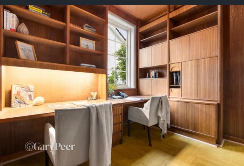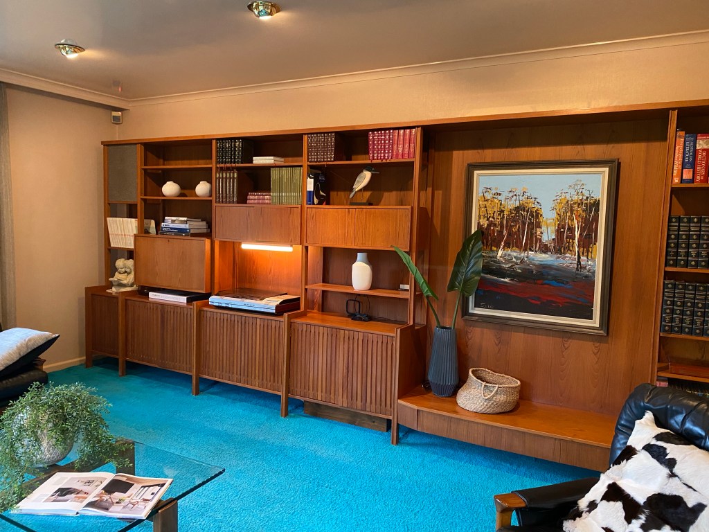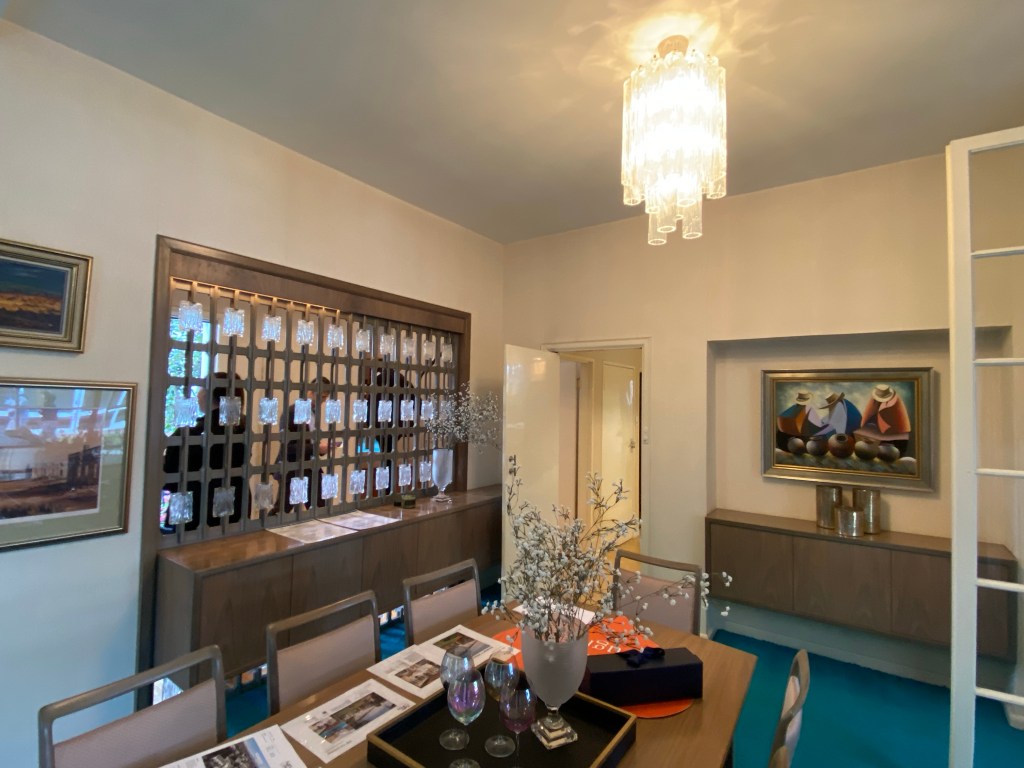 Great 60s joinery in this house on Cantala Avenue in North Caulfield – just happened to pass be when the auction was about to start! It’s a sort of modern Georgian outside, built 1949, but refreshed maybe 20 years later with a whole load of built-ins, starting with the great entry screen. Off the dining room there’s also a bar, a whole wall of shelves in the lounge, and a study with more, and wild turquoise carpets. Some of the other built ins look 1949, as are the steepish stairs, and possibly the bathroom. There’s a sunroom out back probably also added in the 60s, and even a pool house with a roof looks also maybe the same time. The rooms are all modest sizes, and there’s not much back garden, but the front is lush. First time offered since it was built, so that’s why it’s so intact. No heritage listing, so anything could happen. Last 2 pics and plan real estate.