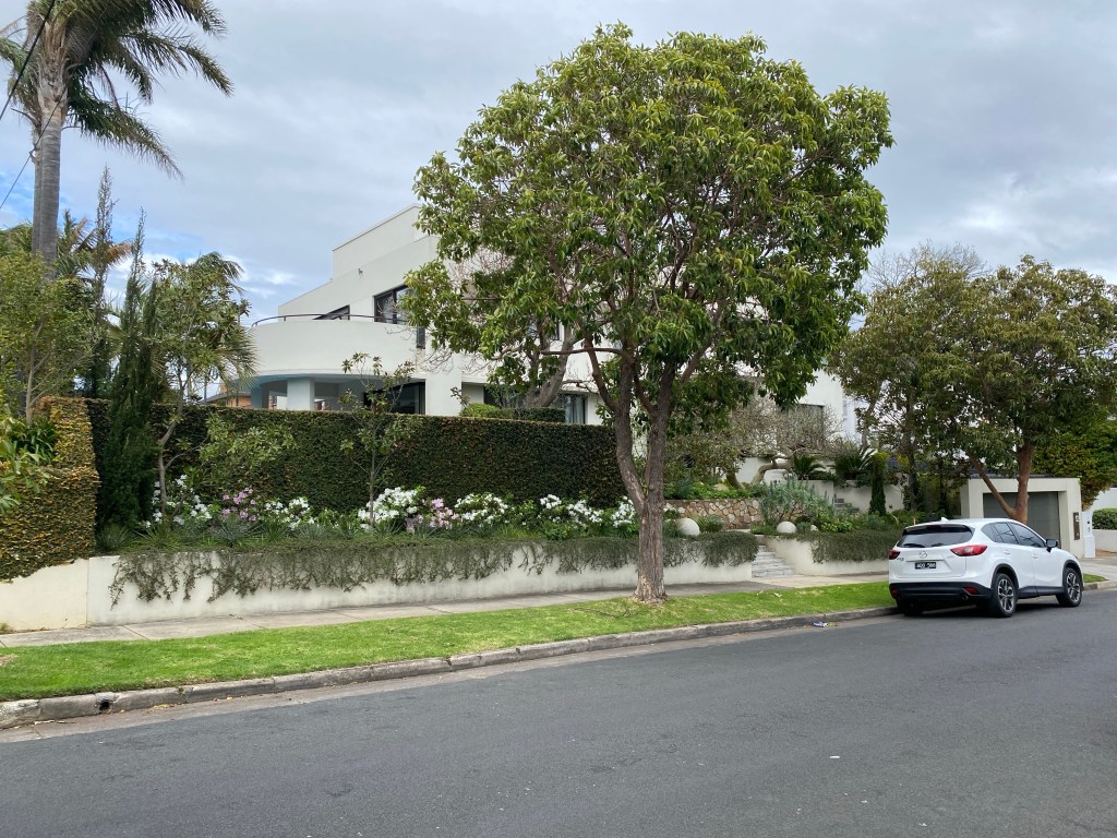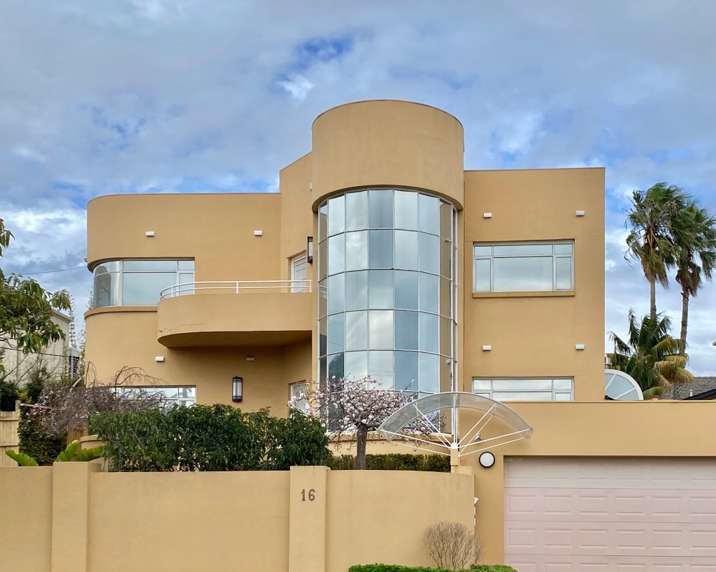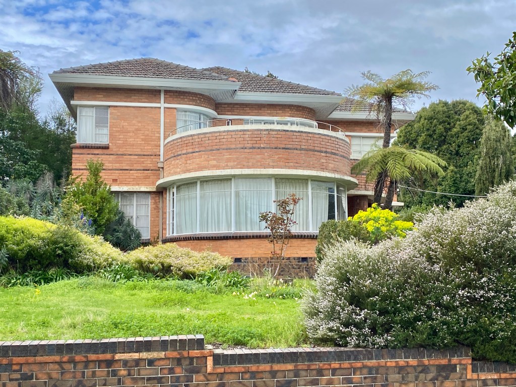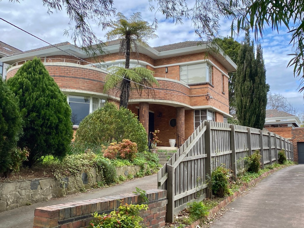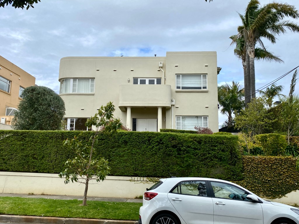 Looks like an 80s attempt at Art Deco, but it actually is an original; it’s in Findon Avenue, North Caulfield, built 1939, but surprisingly the architect isn’t known. But I did find some sale pics. It’s in a street created in 1938, and so there’s a strip of houses all from 1939-41, now a heritage precinct. The one next door is also white but not quite so exciting. Then there’s a nice Georgian one by Yuncken Freeman brothers & Griffiths, and a bit further down a more typical curvilicious brick Deco one, architect unknown, very nice. One in the middle was a very striking design by Edward Billson (last 2 pics) but it’s so altered it’s unrecognisable. Old pics from the heritage report.