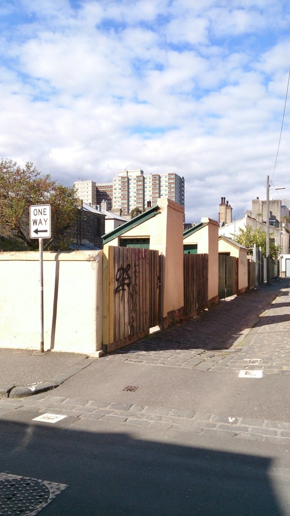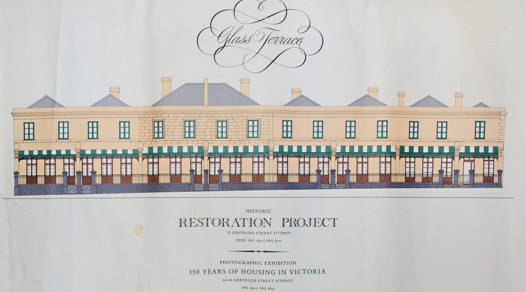Some heritage listed loos, possibly the oldest in #melbourne (well, maybe). Some of the once ubiquitous outdoor lavatories at the backs of #terracehouses – these ones are part of #glassterrace, built 1854-6. The two #bluestone ones in the middle of were built in 1854 and are believed to be the oldest #terracehouses in Melbourne. Built by Hugh Glass hence the name, designed by David Ross in Regency style, just on the edge of the city in rapidly developing #goldrush Melbourne. Rather dilapidated by the late 70s, as in last pic is c1979, and St Vincent’s Hospital was planning to demolish them for extensions, but they were saved, restored, and became #publichousing instead! Which it still is I think. Can’t imagine that happening now. Drawing is from a 1980s poster via Graeme Butler.
