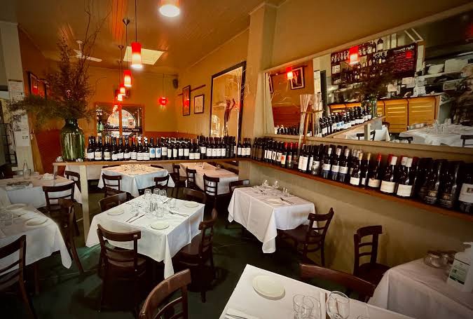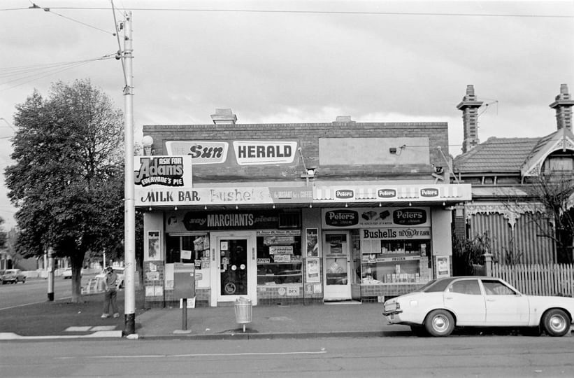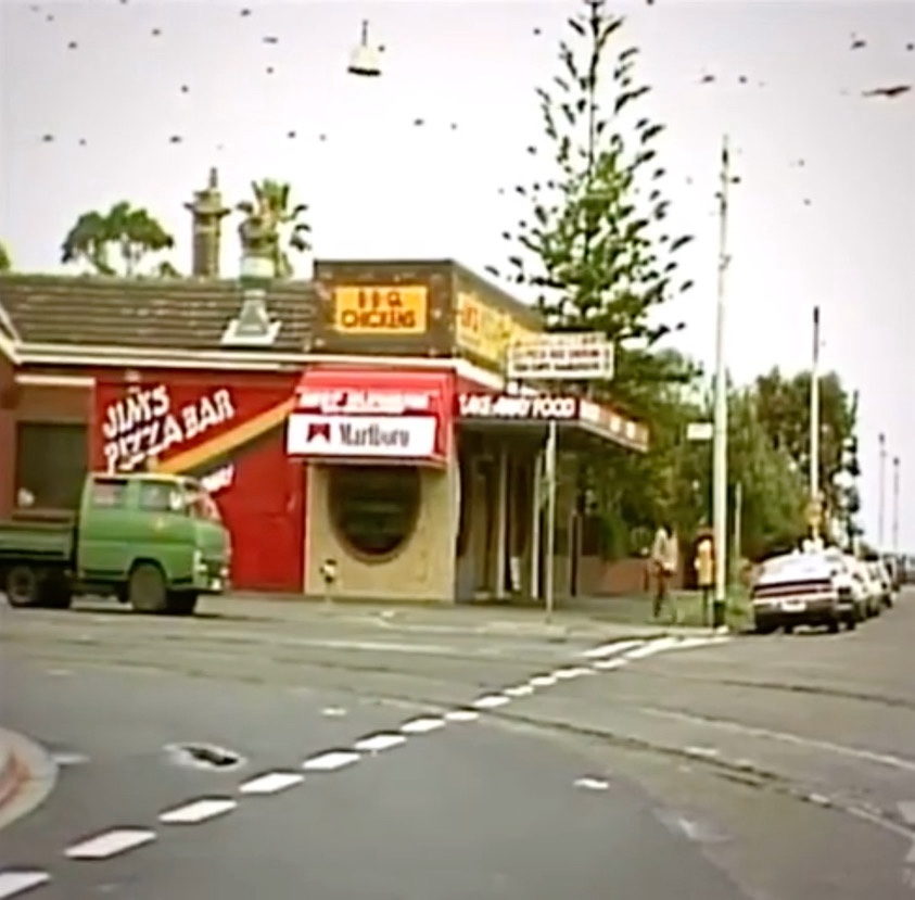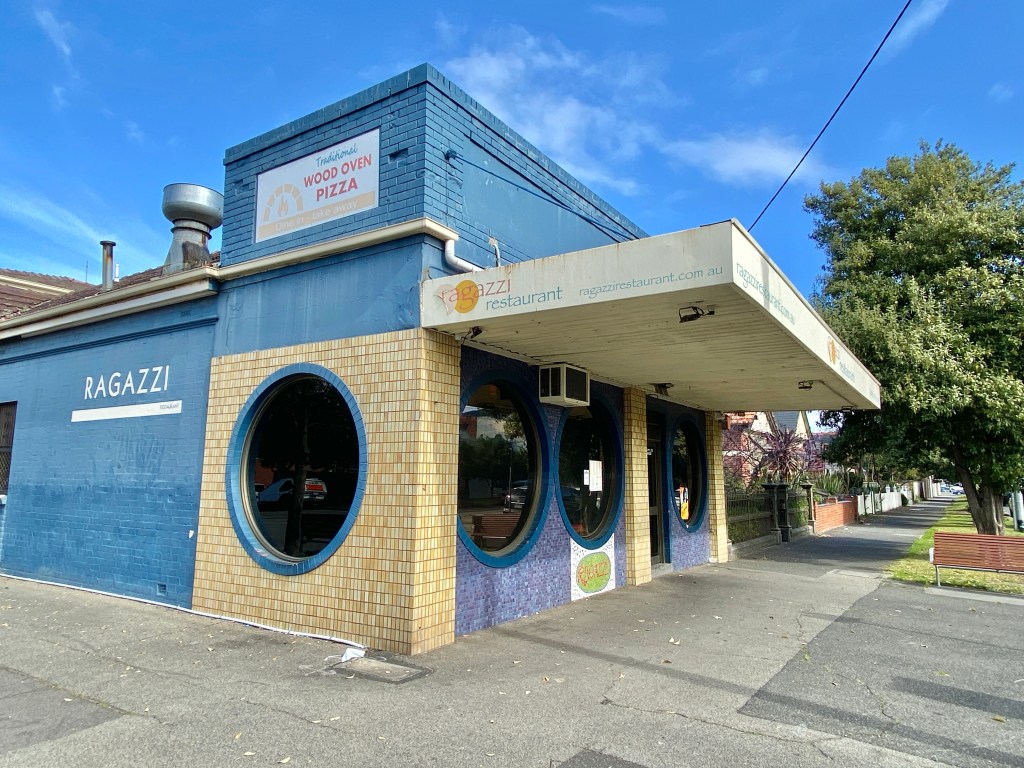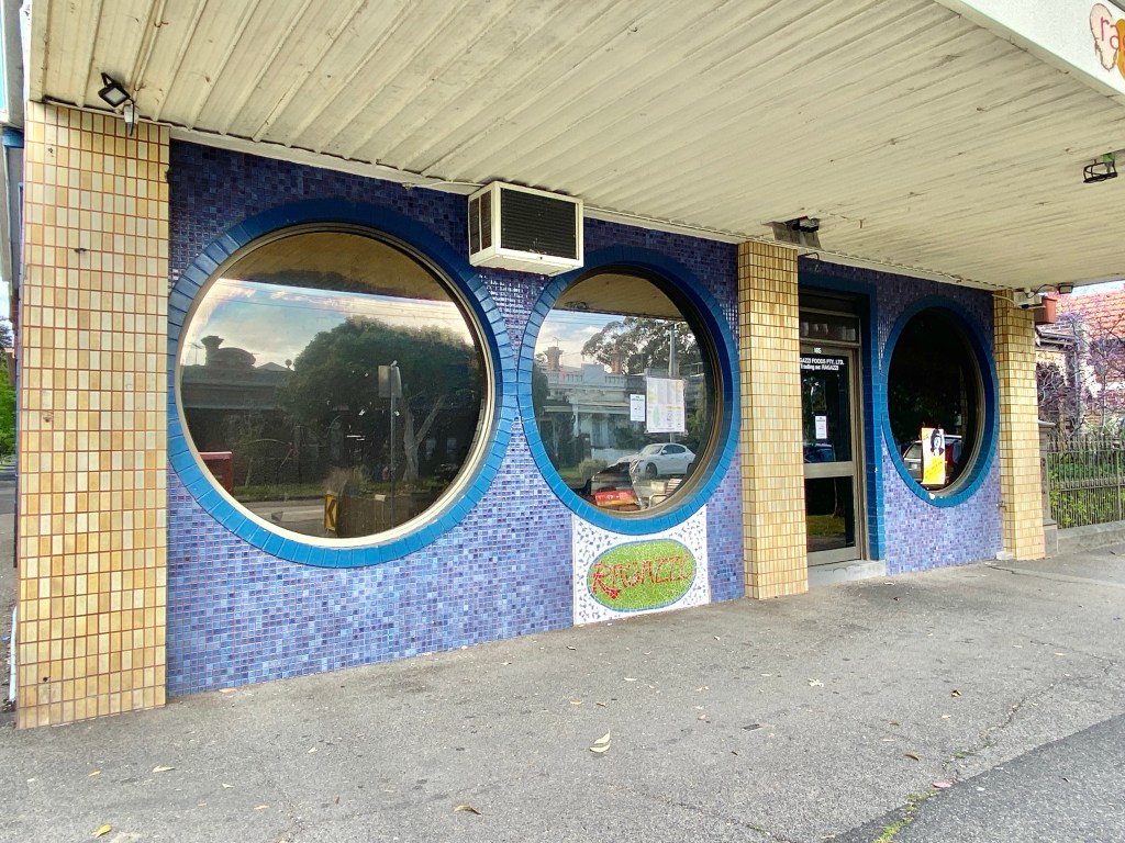 Fun goggle eyed shopfront in Mills Street Middle Park, I’m guessing 1970s. With old reflective film on the windows I thought it was maybe abandoned, but I peeked in a gap and saw an old bloke working away in some kitchens – then I noticed the outdoor seating, doh! It’s called Ragazzi, and the website promises dining will be a revelation, and the ‘full range of red and white wines’. Found one pic of inside. Any reviews ? Update : comments say yes it’s good, been there 20 years and was Jim’s Pizza for another 20 years before that, when it featured in Sons & Daughters, and a milk bar before that, and before the windows, pic 3, 4 from @vinternet2000.