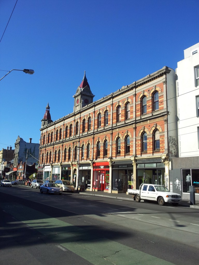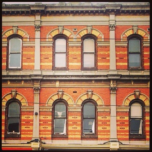 Obligatory shot of the Beswicke Building in #brunswickstreet, 1888. Always thought that was just the #buildingname but actually thats the name of the #architect, John Beswicke, so it’s one of the few buildings named after its designer in Melb. Just read a book on his work by a descendant and he did lots and lots of houses and shops, and some town halls; many are just typical of the period, except this one, which is particularly elaborate #polychromebrick overlaid with #classicaldetails, with a little corner turret and another stubby one in the middle. He did two more similar sets in auburn rd hawthorn but this is more impressive. This seems to have been built as shops with offices above rather than homes for the shopkeepers, with a corridor upstairs running the length of the building, though I think there’s flats there now. It was built for the Australian Property & Investment Co, who also built the long demolished 12 storey Australian Building aka API/APA building in Elizabeth Street which Beswicke had a hand in too. It’s lost the verandahs, and the balustrade and pediments but not the towers thankfully. And of course it’s home to the Black Cat, since 1982, that’s 42 years now, jeez, I remember how exciting it was ……