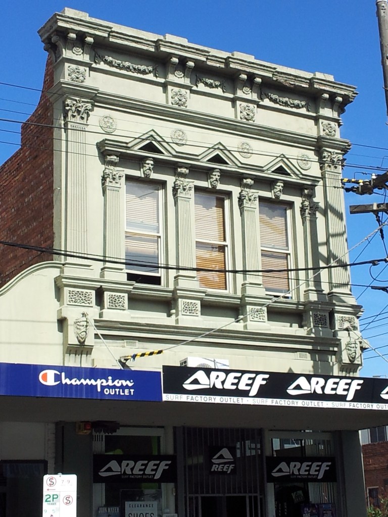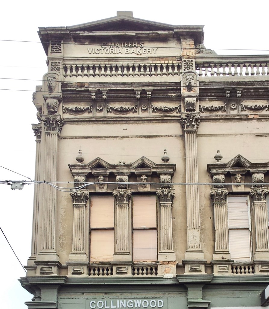 George Mateers Victoria Bakery, Johnston Street, Collingwood, 1888. Quite a statement for a baker, but that’s what they did in those days. The designer was Norman Hitchcock, whose style was quite unusual and often very elaborate, with unique elements which means you can spot them, like the stumpy pilasters, with brackets on top before you get to the cornice, faces for keystones, and in this case little triangular pediments rising out of a straight cornice; the window treatment is repeated on another shop-house of his in Smith Street from 1885, pic 3. Photos from 2013.