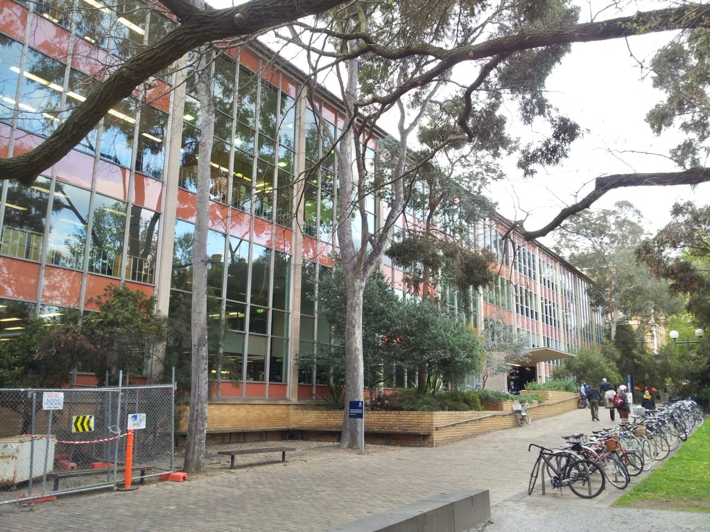 #modernism and #gumtrees at the #baillieulibrary at #melbourneuniversity, a very long facade of rather typical curtain wall, but impressive. Designed by the office of JD Scarborough, it was actually built in two stages, with the southern part completed 1959, which has nice double height spaces and an interesting 1/2 spiral stair; the northern part was added c1967, with slightly less refined framing, somehow not nearly as aged either. There’s a plan to demolish that end, so as to expand and install an auto book retrieval system – so much for that great long wall. Not heritage listed apparently. 2024 update : well that never happened thankfully, instead the interiors have been progressively updated, seem to recall it was somewhat intact before. Still not heritage listed.
