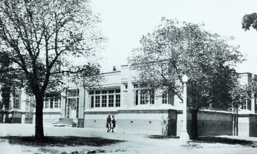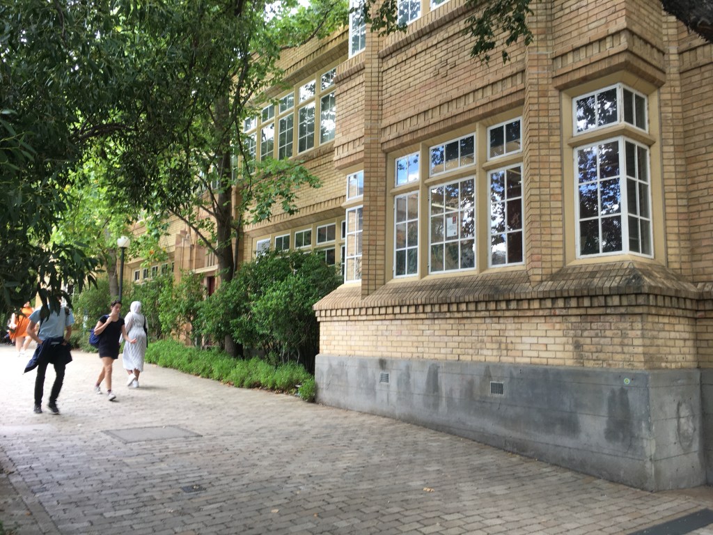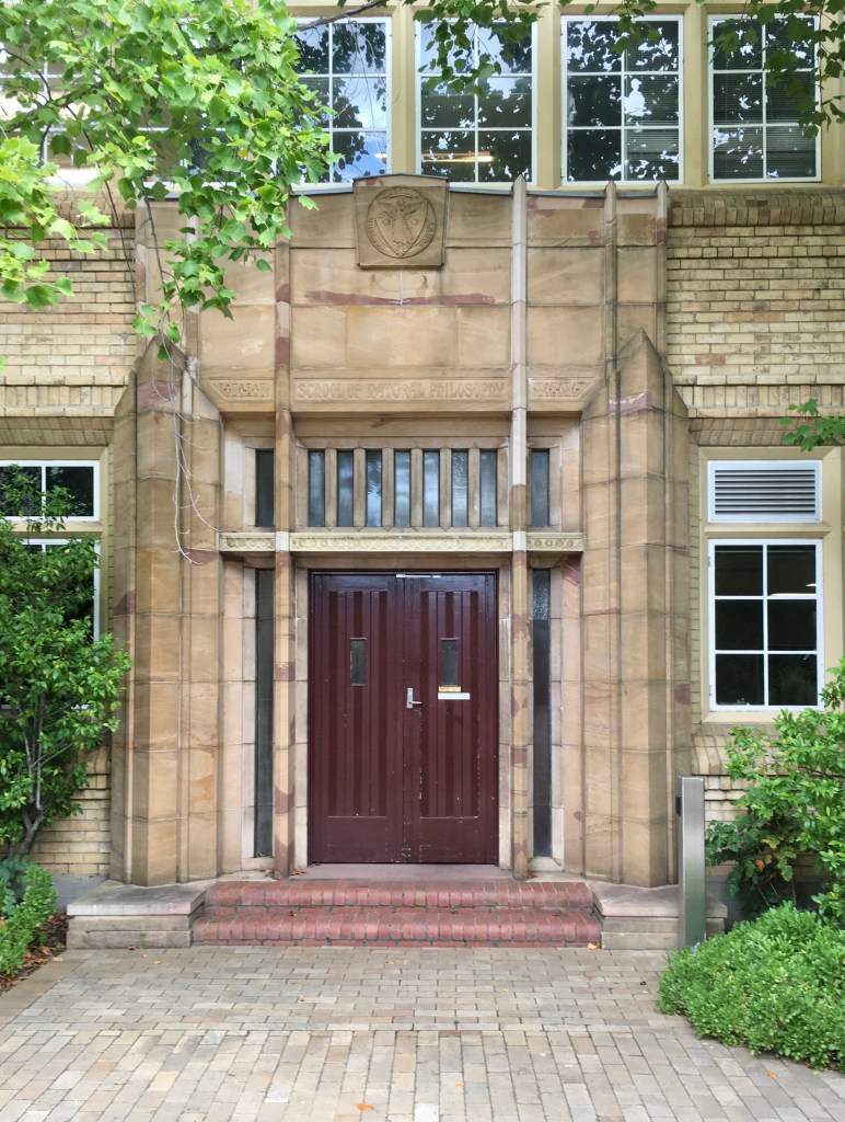 The old School of National Philosophy extension at Melbourne Uni is in a very interesting style that’s broadly Art Deco but the diagonal verticals lend a suitably Gothic flavour, all in cream brick laid in a variety of ways. Designed by Percy Everett, chief of the PWD, just about everything he did is worth a second look, whatever the style. It was built in stages, just single storey at first, opened 1939, then a second floor in either 41 or 48, but the planned 3rd floor was never added, which had gables that would have made it a bit more traditional in style. Photos March 2020.