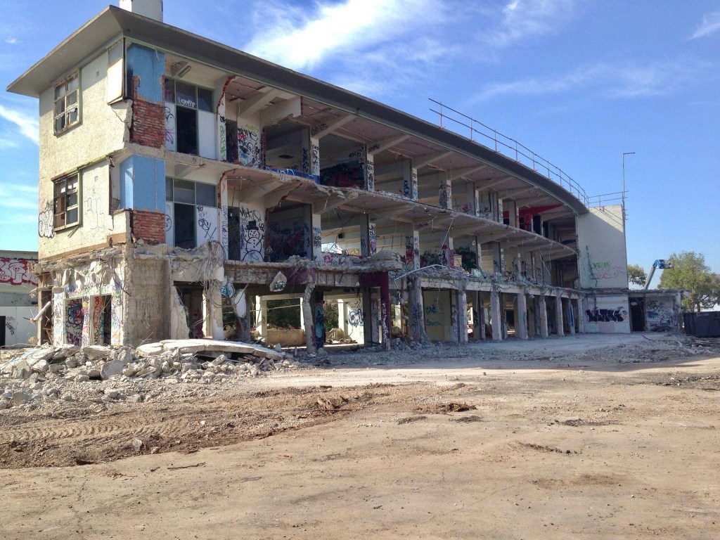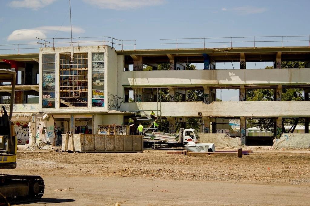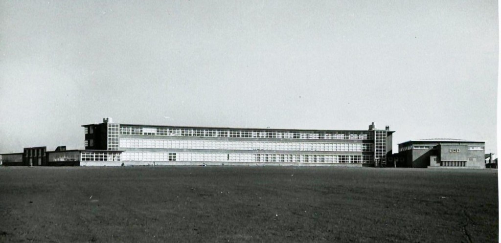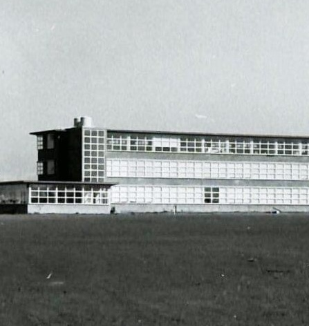 This looks to me like a 1920s German Bauhaus or Russian Constructivist sanatorium or institute, but once stood – in Heidelberg ! A late work by Public Works Chief Architect Percy Everett, Heidelburg High School was designed 1951, and completed in 1955. I guess it was just concrete and timber framed windows, but on a huge curve, and a lot of playing field in front to the north (later filled with other buildings). After various mergers, the site, on Banksia cnr Oriel, was cleared in 2014, part is now a special school and a new community hub, the rest is still empty; they dont have a high school. Only found this one photo of it, but theres a few of it during demolition.