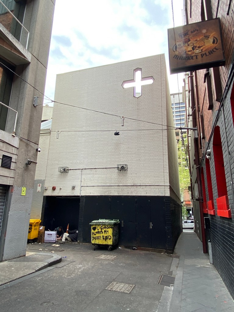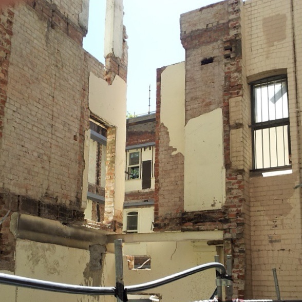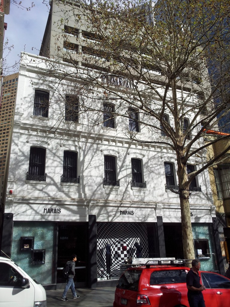 A crazy bit of facadism from 2013; this is the back of 73 Bourke Street, now Marias. Looks better than just keeping the front wall and a bit of side wall, but it’s a weird interpretation of ‘no interior controls’. Even more weirdly, there’s a big blank wall there now, and the building is squared off, so apparently the retained walls are now inside. What’s more they just painted the facade white, when originally it was two tone bricks, but again, the controls say if it’s already painted (pic 5, c2000) you can paint again if you like.
