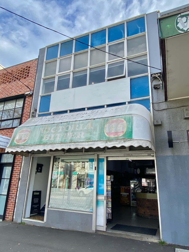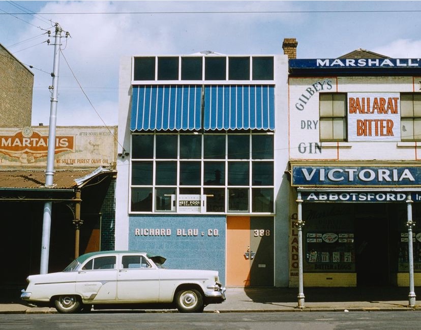 Cute little mid century modern shop/office in Clarendon Street, South Melbourne; a ‘curtain wall’ made out of timber framing, with painted glass panels in a fetching mid blue. Thanks to @davidnhelms for alerting me to more detail, and so found a photo from the early 60s ! Showing it was all glass originally (some later painted blue I guess), had a great tiled ground level, and was perhaps built for Richard Blau. The sign in the window is for European emigre architect Ernest Fooks, and the photo comes from his collection now at the @library_vic, so presumably he designed it. He used timber window walls on some of his houses too.