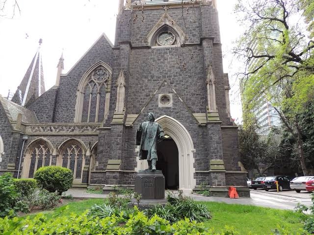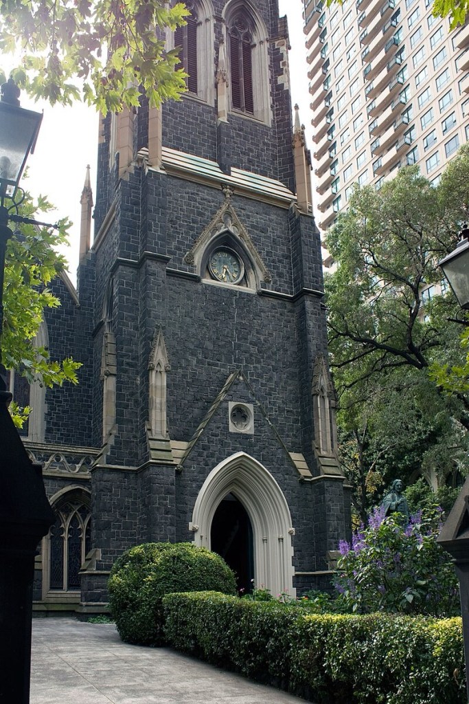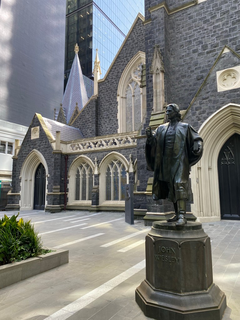 Don’t think I like the new landscaping in front of the Wesley Church in Lonsdale Street; it was uninspired concrete lawn and bushes before, now has more plants and places to sit, but an awful lot of paving – did they think it would be thronged with people ? And why the pattern ? It leads the eye to the church, but it’s not like that’s needed. In fact the landscape design is all rather restless, and detracts from appreciating the Gothic splendour. But it’s not a disaster. The 1935 bronze of John Wesley by Paul Montford looks all cleaned up and fine, except the spiders have already occupied his nose. I feel like there’s more webs than there used to be? In every gap in every building ?