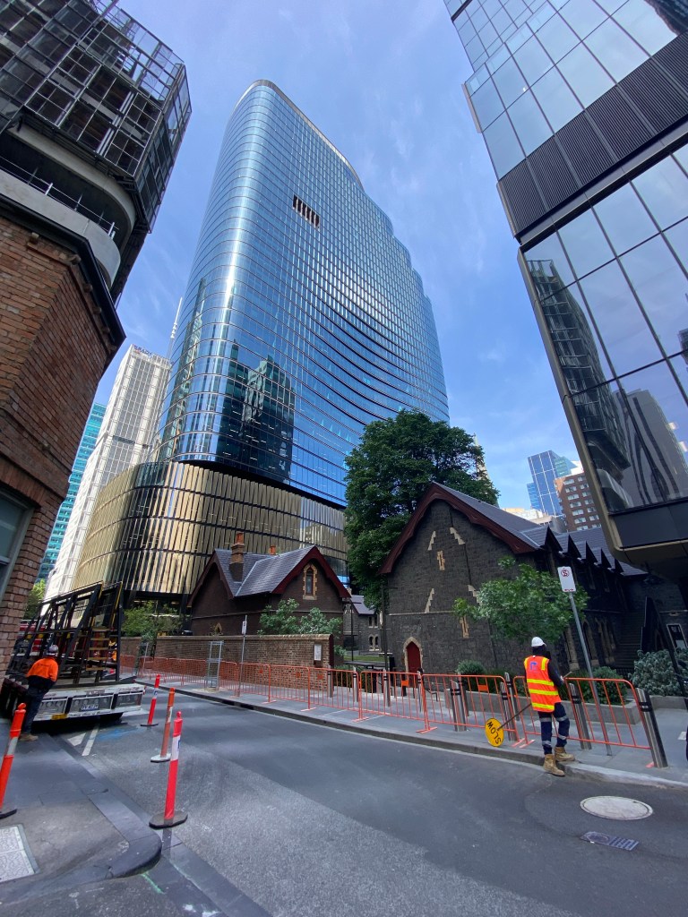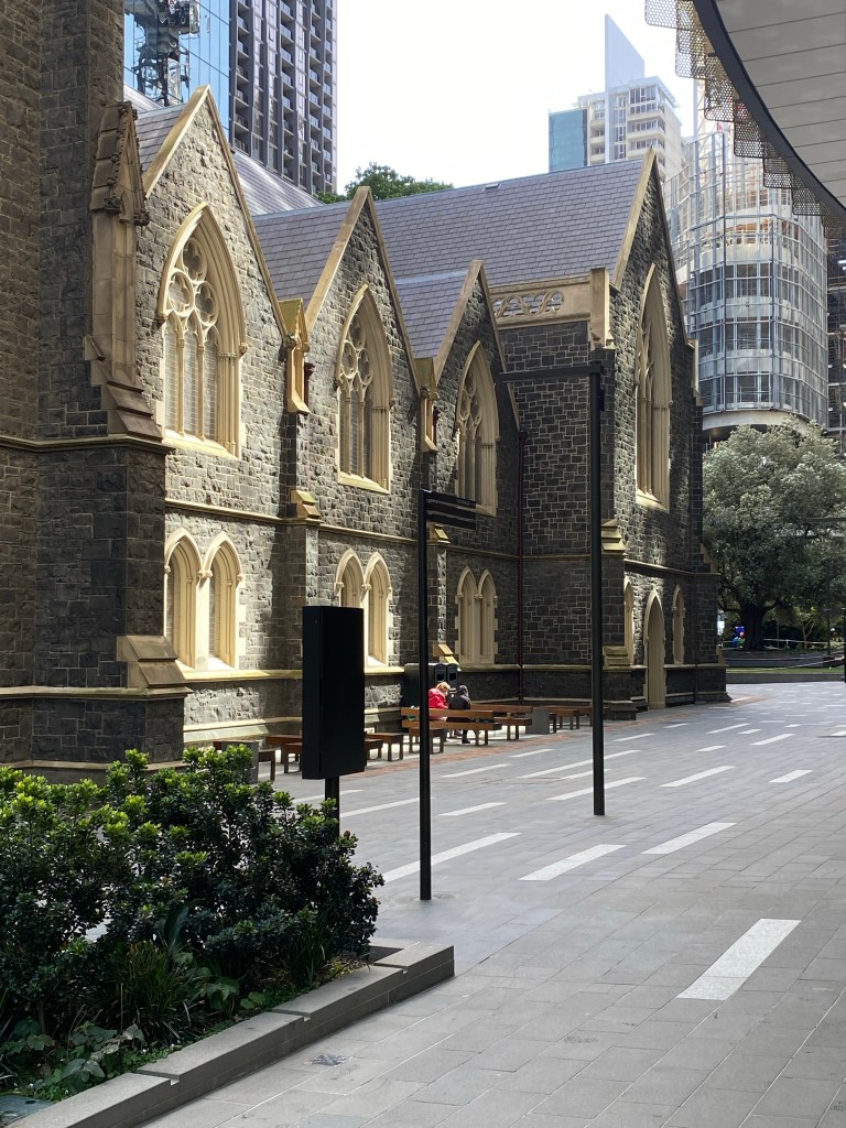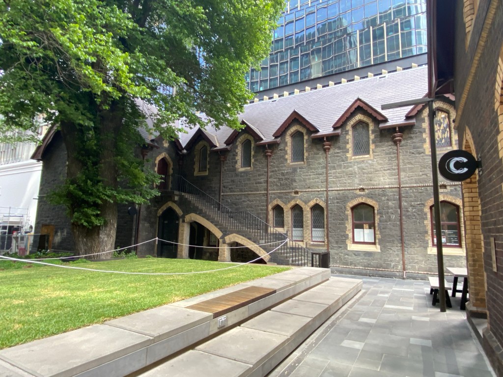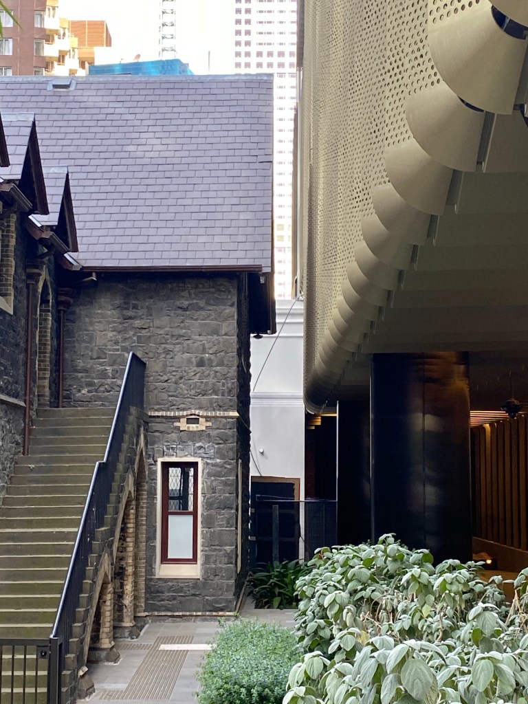 Even though one is so much bigger than the other, and they’re very close, at ground level you don’t get the feeling of the new dominating the old. This might be partly because of all the trees you don’t get to see them together in a long view, and partly because there’s a podium level with different more detailed treatment, and the tower itself is set back. There’s also a high space under the tower at ground level which helps, but any delicate effect is lost at ground level with the round structural columns standing clear, covered in some burnished luxy gold stuff. The Wesley Church in Lonsdale Street is a very important early Gothic design by Joseph Reed, finished in 1857; the tower was finished in 2021, designed by @coxarchitecture, and part of the deal was $5mill to restore the church, not that it was falling apart, but much all the stonework is now new, though they didn’t recreate a couple of the missing pinnacles. Nearly forgot – would have been better of course to have no tower, or greatly set back, and kept the Gothicy 1920s Princess Mary Club, but the church authorities had hopes for a tower from about 1988, and just let it fall apart. Shows that even a church organisation can get bedazzled by the notion of property development. The deal also included ground rent from the developers, I hope at least it’s indexed. Photos of the club from Facebook, and of the plaque snow installed in the garden from @chrismbr, since I didn’t notice it.
