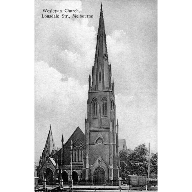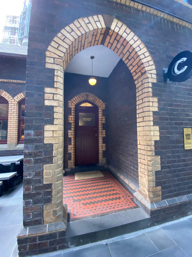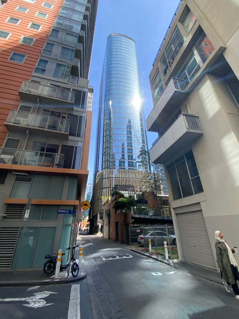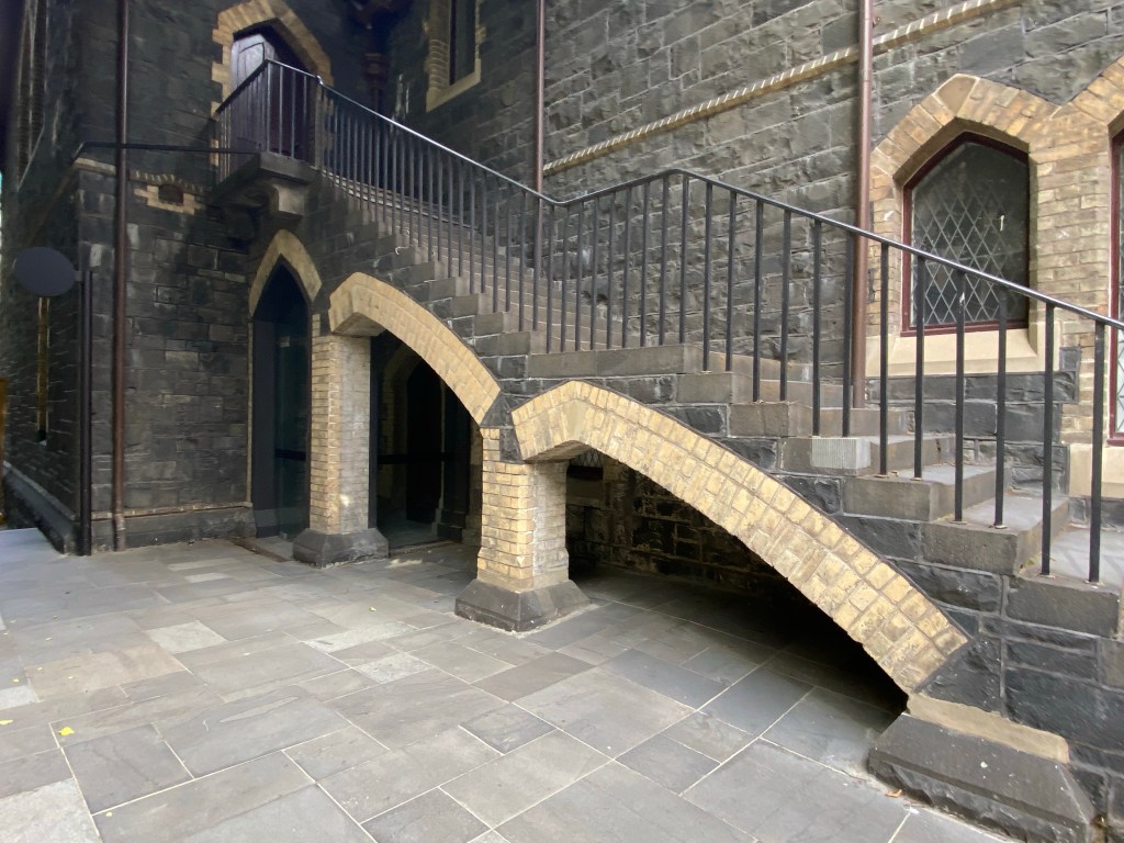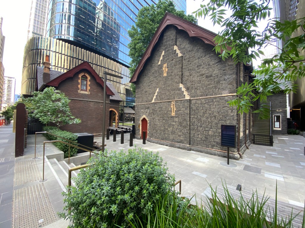 Even though one is so much bigger than the other, and they’re very close, at ground level you don’t get the feeling of the new dominating the old. This might be partly because of all the trees you don’t get to see them together in a long view, and partly because there’s a podium level with different more detailed treatment, and the tower itself is set back. There’s also a high space under the tower at ground level which helps, but any delicate effect is lost at ground level with the round structural columns standing clear, covered in some burnished luxy gold stuff. The Wesley Church in Lonsdale Street is a very important early Gothic design by Joseph Reed, finished in 1857; the tower was finished in 2021, designed by @coxarchitecture, and part of the deal was $5mill to restore the church, not that it was falling apart, but much all the stonework is now new, though they didn’t recreate a couple of the missing pinnacles. Nearly forgot – would have been better of course to have no tower, or greatly set back, and kept the Gothicy 1920s Princess Mary Club, but the church authorities had hopes for a tower from about 1988, and just let it fall apart. Shows that even a church organisation can get bedazzled by the notion of property development. The deal also included ground rent from the developers, I hope at least it’s indexed. Photos of the club from Facebook, and of the plaque snow installed in the garden from @chrismbr, since I didn’t notice it.