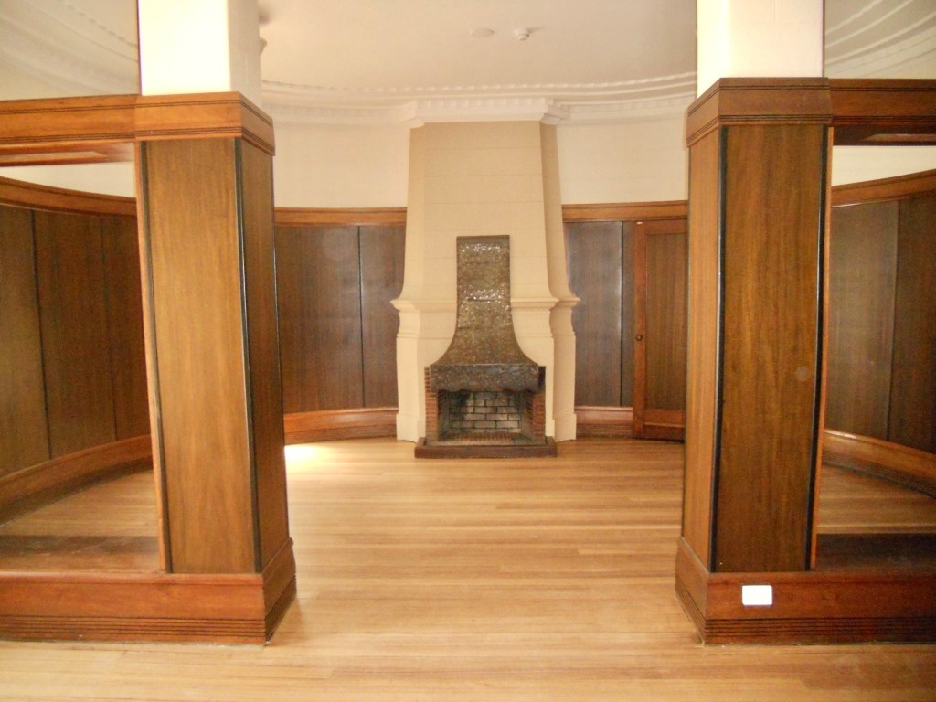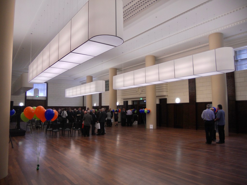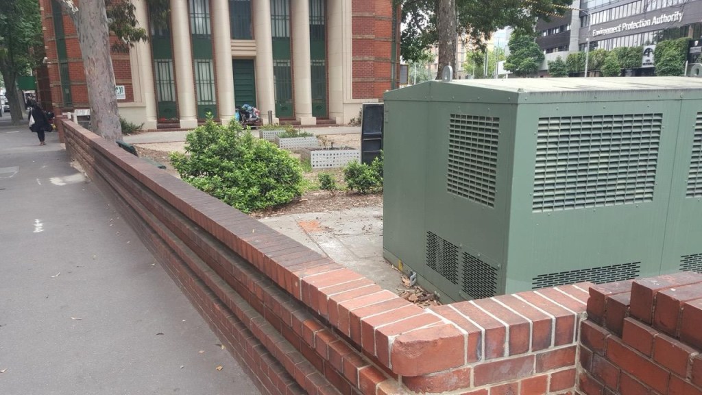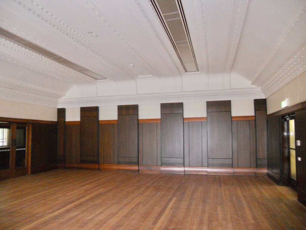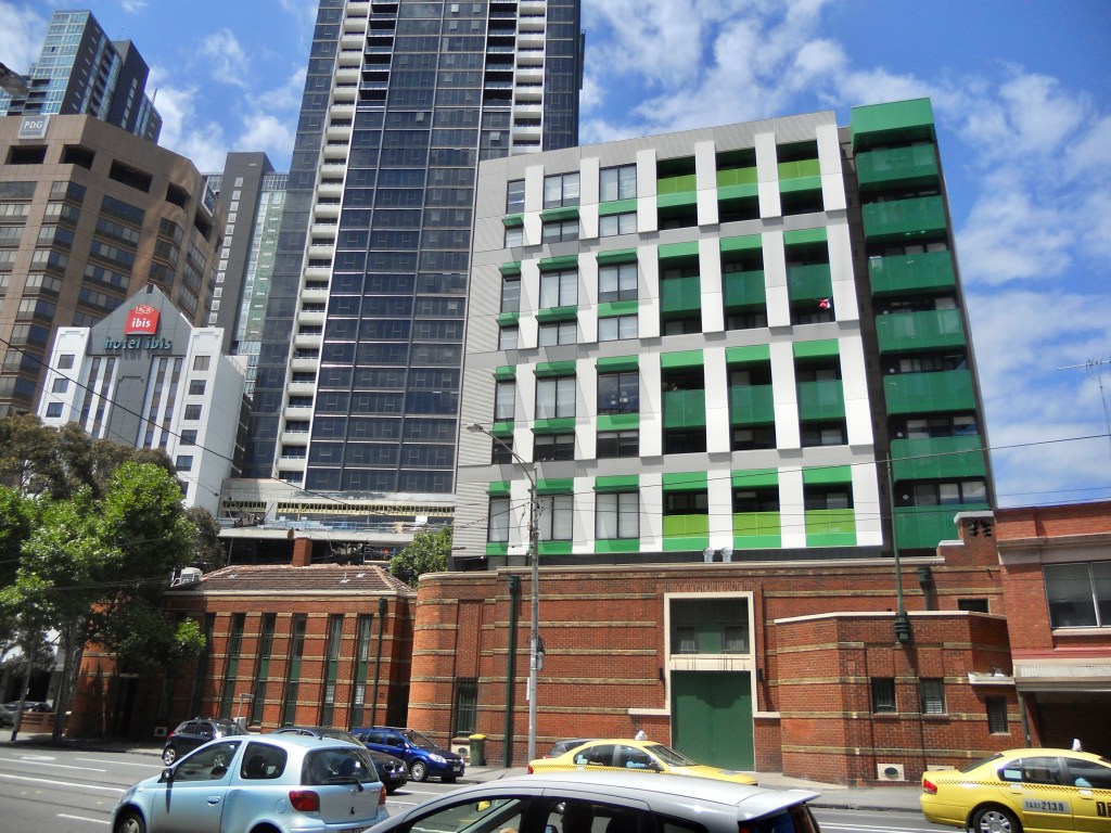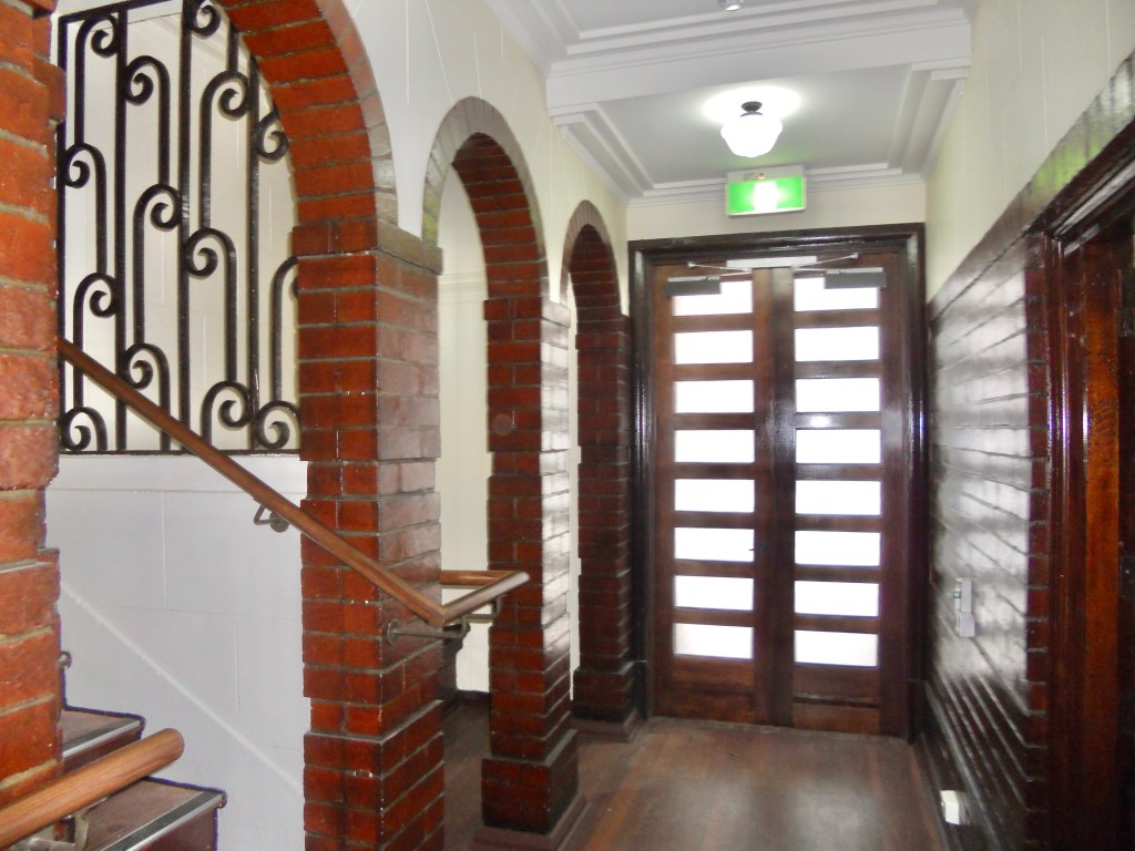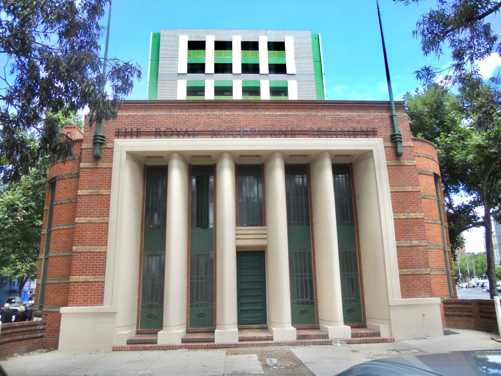 The very fine Royal Melbourne Regiment Drill Hall in Victoria Street near the Queen Vic Market, was built 1937 and designed by George Hallendal. He was Commonwealth architect for work in Victoria at the time, and designed a few other great #drillhalls but this is the grandest. It’s got a stylised classical portico (somewhat hidden by trees), which gives access to facilities for officers, including a mess hall and a bar, all Art Deco ish glazed brick and dark stained timber. Out back it’s got the actual hall, quite large, now a bit altered – by the late 2000s, it was owned by the @cityofmelbourne, and so eligible for federal funds for social housing, so a fairly crazy plan was hatched to take the roof off the hall, put columns in, build housing on top, and use the hall as a multicultural/community venue. It was completed in 2011, when I took these photos, and while it would be better without, the thing is at the rear, and the hall looks ok, though the big lights detract almost more than the columns. I don’t know who got to use the officers rooms in the end. And at some point someone put in a electrics box in the little triangular forecourt, which now seems to be a community garden. I’m still annoyed by the housing bit, I mean it could have gone anywhere rather than on a heritage building, and been much bigger to boot.
