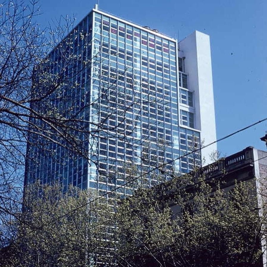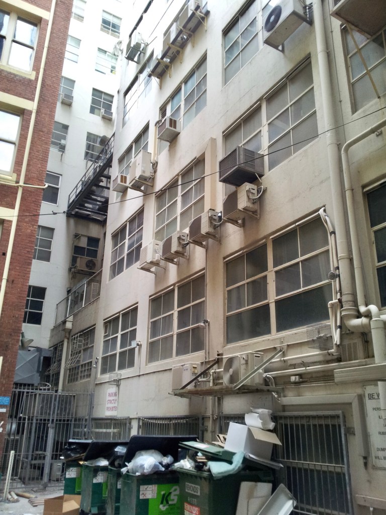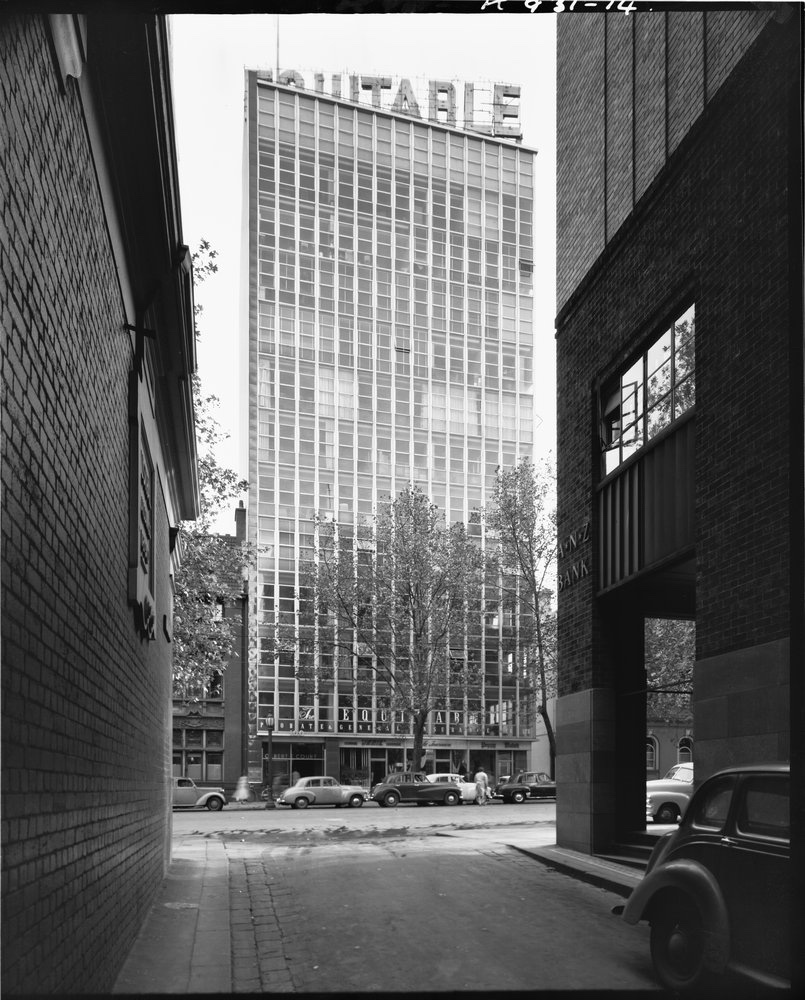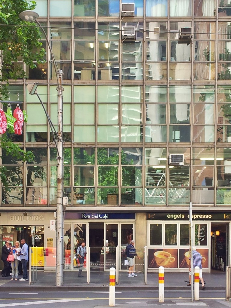 Coates Building at 20 Collins Street, the most transparent of Melbourne’s early curtain office blocks, and a fave (the glass is actually slightly green). No aircon so no dropped ceilings that needed solid spandrels to hide them (hence the attached aircons). It was however a design choice to have the glass go right to the floor, rather than a solid panel, and to have the roof balustrade as part of the curtain wall too! Whereas the side wall visible down the lane behind is solid with rectangular steel framed windows.