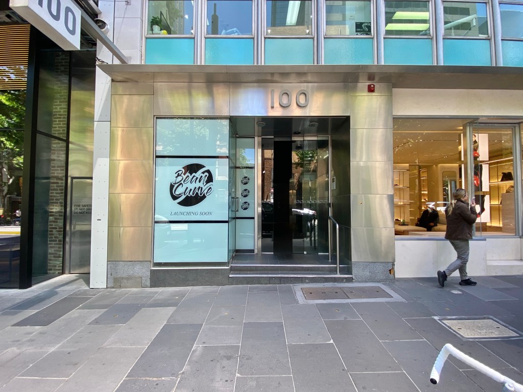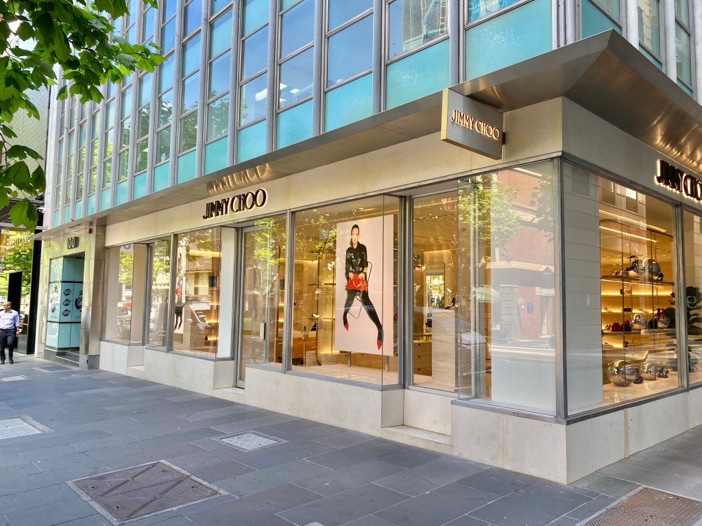 The shopfronts at 100 Collins Street (JA LaGerche, 1955) are pretty intact, which is great given the building wasn’t properly listed separately until 2023. In fact renovations for Jimmy Choo this time last year got them a bit closer to original; the base which was 90s grey granite tiles (pic 2, 2011) is now a pale stone, more like the original, though that looks like it was marble, in smaller blocks. They seem to have kept the aluminium or perhaps steel window frames, and all the door recesses, but on the other hand kept none of the frameless doors, in fact pretending 2 were never there. And it’s all bare luxe elegance rather than three different shops, but it all looks nice.