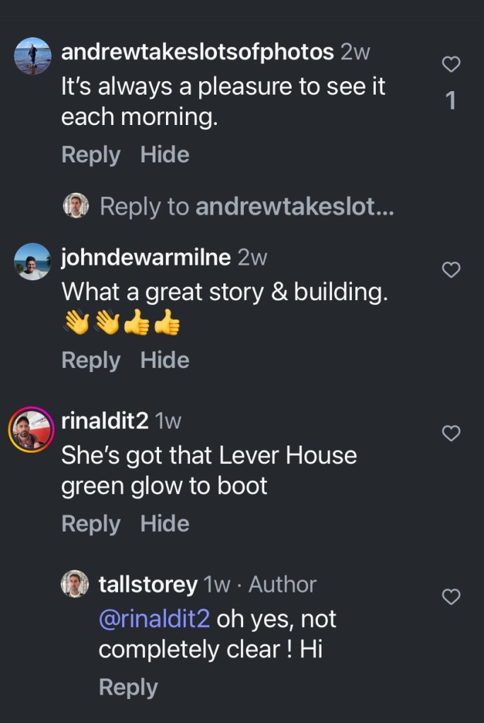 Heritage listed properly as part of the 2023 Hoddle grid review, where I got the sketch and info. It was reported in the same year that some developers had bought up units and now have control, so it might end up as a modernist facade with a new tower behind, and meanwhile two of the three shops have been empty since covid. I remember in the 90s you could take the lift and press ‘roof’ and the door would open straight out onto the roof, and you could peer down Collins street ! My pics 2013,14.