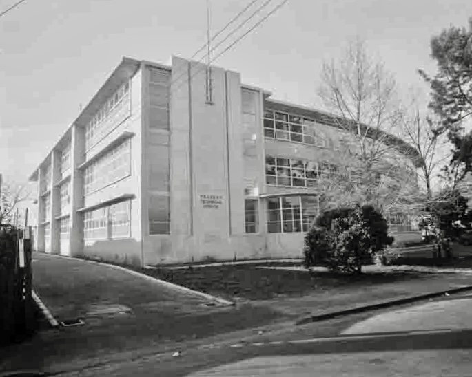His late works from the early 50s seemed to be just render, with very thin details, like the Geelong Junior Technical College Machine Shop (Moorabool Street, dem), a box with a thin flat roof and strip windows where the horizontality is cancelled out by the rectangular surround, and Prahran Girls Tech, Hornby Street, Windsor, (1955, dem), which was still a bit like his earlier work with a vertical section contrasting the main horizontal body but rather confused in this case.