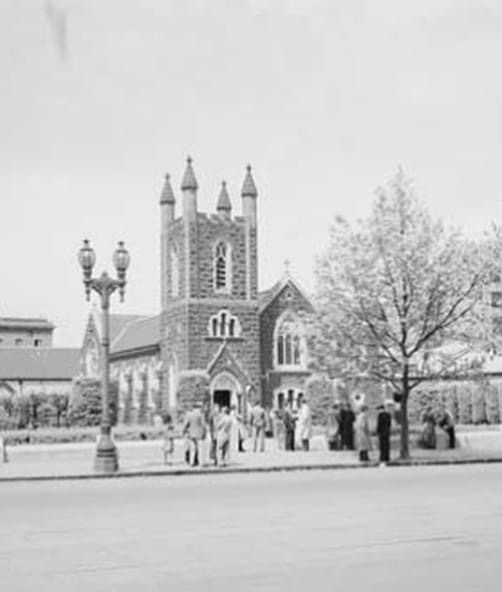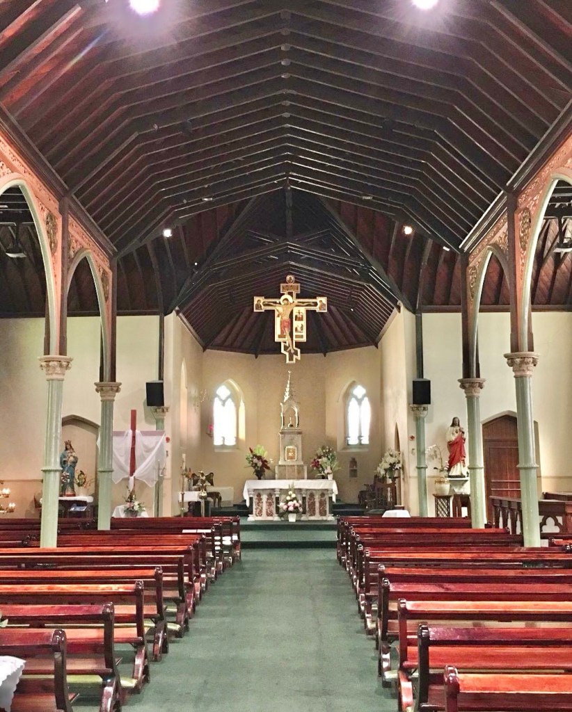 St Augustines Bourke Street, main nave and facade 1870, TA Kelly. The cutest little country town sized church, but on a main street in the city, within its own little plot of greenery. It’s in the western end of the city, part residential part warehouses when it was built, then later much more commercial, now apartment towers springing up up all round. The tower was built, or finished, not sure, in the 20s, which explains its more Tudor look, rather than having a spire. Altogether very picturesque. The second photo is from the 50s, before fence, trees or anything. Inside, the aisles are supported by #castiron, complete with gothic #castironlace bracketing using intertwined letters ST for St Augustine and IHS for Jesus Christ Saviour (in Greek). Pretty. The only cast iron structure like this in a church in Victoria I can think of. The rose window by Ferguson & Urie in pink and green is very pretty too.