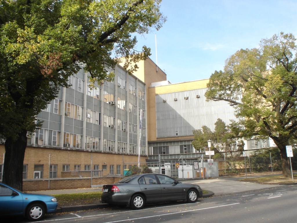 Photos I took of the old Dental Hospital in 2009 just before it was demolished for the cancer centre; I thought it was quite nice, or at least the back was, with angled bits, cream brick, an early modern sort of look, but all rather retro for 1963 when it was completed. Just discovered it was first designed in 1953, by my fave architect Percy Everett, the year he retired from Public Works – but what was built only follows the general lines, and it’s much less traditional, notably with curtain walls instead of rectangular windows. The main front on Grattan Street was actually quite boring, but the lecture theatre stack on the west end was very nice, with its oval form. Everett’s design was to be executed by Frank Heath, who may have redesigned the whole thing, but he was also on a government panel of architects so maybe it was a committee thing. 1953 design image rear from Building Magazine, front State Library, then as built, State Library.