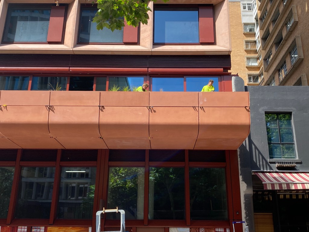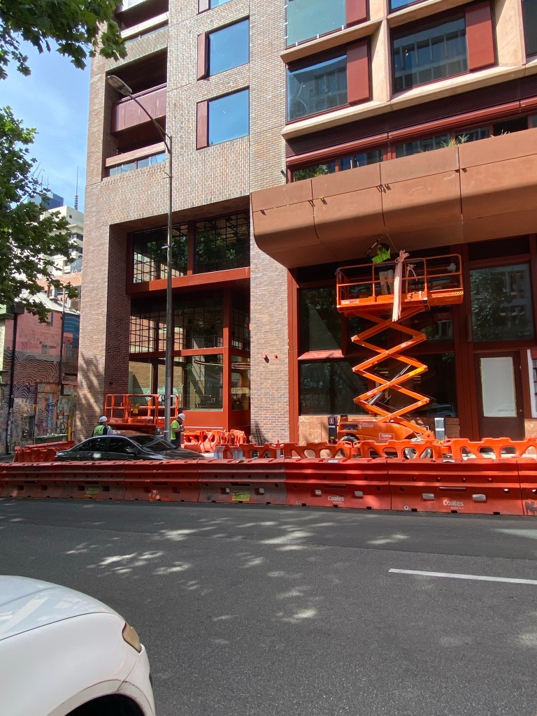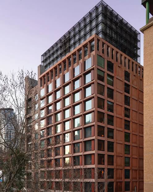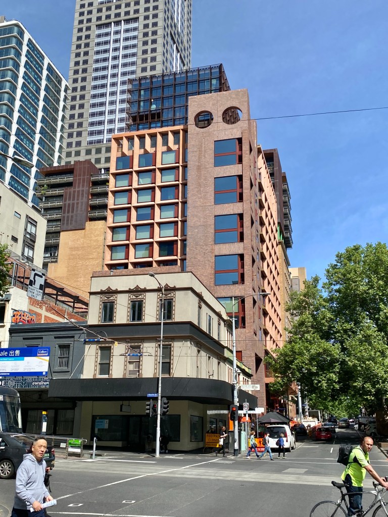 Saw recently that the new hotel on Russell Street is nearly finished, and must say I quite like it ! Designed by @kennedy_nolan, it’s got lots of brick, earthy colours, varied massing and a sense of depth, and their signature cut out circles. From Bourke Street you almost don’t notice it. Much better than the first shiny glassy thing designed by @buchan_studio. It also helps that it’s in a discretionary 40m height limit area; I see they got a few extra setback floors above that point, but all black, looks fine. Interesting that not a single article about it mentions the height limit. The only drawback is that it replaced the nice though not outstanding 1923 office block, originally with Olympia Motors car showroom on the ground floor (!), and from 1972 home for the Theosophical Society. It should/could have been part of a heritage precinct going up Bourke Street, but there’s just lots of individual listings instead. It also took out the Army Disposals next door, but it was very altered; that’s less variety to the street, though they promise lots of ‘activation’ including down the laneway. When I was passing they were busily planting out the balcony. It’s right across from the @candalepasassociates QT Hotel, also masonry gridded and 40m, but lacking the variations and warmth. It’s called Melbourne Place, not very imaginative, but it’s also the name of the lane. Pics 6,7 from Kennedy Nolan website.