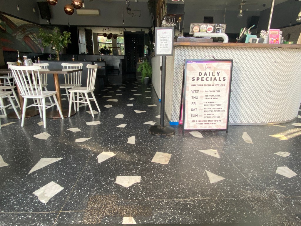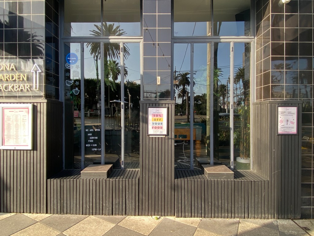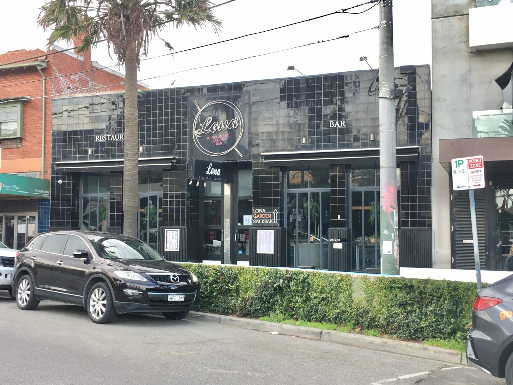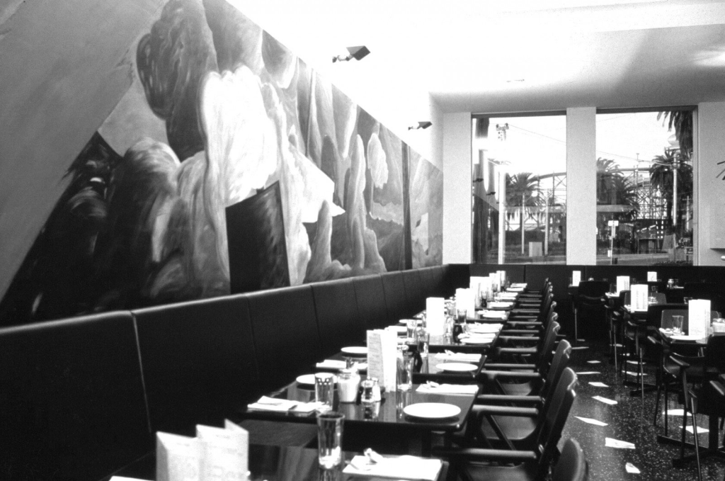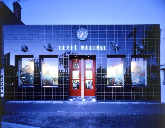 A bit of groovy 80s St Kilda, which is still there, and heritage listed (!). Cafe Maximus in Acland Street opposite the McDonalds was created in 1988 by converting earlier shops, and was designed by Allan Powell, who also did Di Stasio in Fitzroy Street the same year. Both were part of the revival of St Kilda from the somewhat sleazy 70s, but while the latter is still going and largely unchanged, this one has changed a few times, lost various bits, and the current signage is just tacky. Richard Peterson writing for the St Kilda Historical Society felt the black tiles evoke something of 1930s glamour, and quoted Allan Powell saying the (long gone) bronze seashells on the upper facade and doors, by Peter Cole, were intentionally kitsch. Inside there’s a splashy mural by Stephen Hennessey, covered over, then uncovered in 2015. A bigger one as seen in the old B&W by @roger_moloney_art_paint either gone or still covered over. The terrazzo floor looks very 1988 to me too. It was identified in a 1992 heritage study, which included some very recent places, but possibly not protected until 1998, the bronzes and clock gone by then. It looked better originally but I still like it, though completely lost in the clutter. First pic and B&W pics from Powell & Glenn website, pic of mural and artist from the Age. (I also recall this being the scene of police caught late night dancing on tables in the 90s, not the European style bar culture that was envisioned when liquor licences were broadened. Or perhaps that was Greasy Joe’s next door).