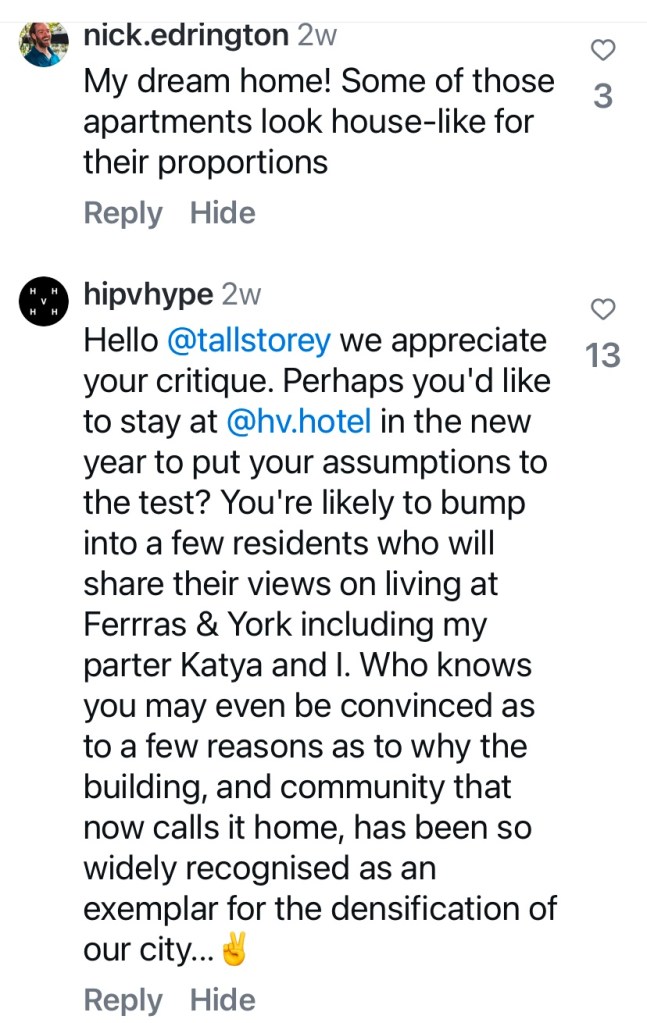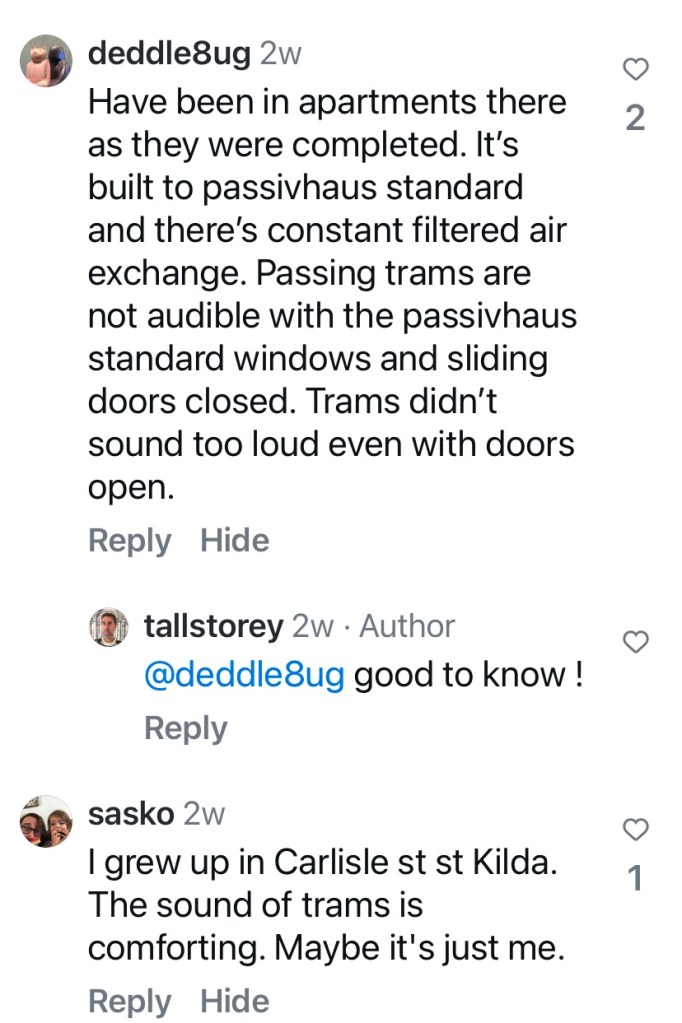 Bit surprised by this one, jammed up against the 96 tram line at South Melbourne, though I’d seen the other side in passing. I suppose I shouldn’t be, there are others almost as close. And then more surprise, it was designed by @sixdegreesarchitects, and won the Australian Institute of Architecture National Award for multiple-residential last month. It’s got all the nightingale-style features, like cross ventilation, open access corridors, nice materials, low energy use, communal roof etc. Built by @hipvhype, they also bought offsets for the carbon the project produced ! You can rent a top level maisonette from @hv.hotel. I guess some triple glazing would deal with the sound of the first tram at 5.30 am. And of course if Melbourne just keeps adding up to 100,000 people a year, we’re going to see more squeezy and taller developments.