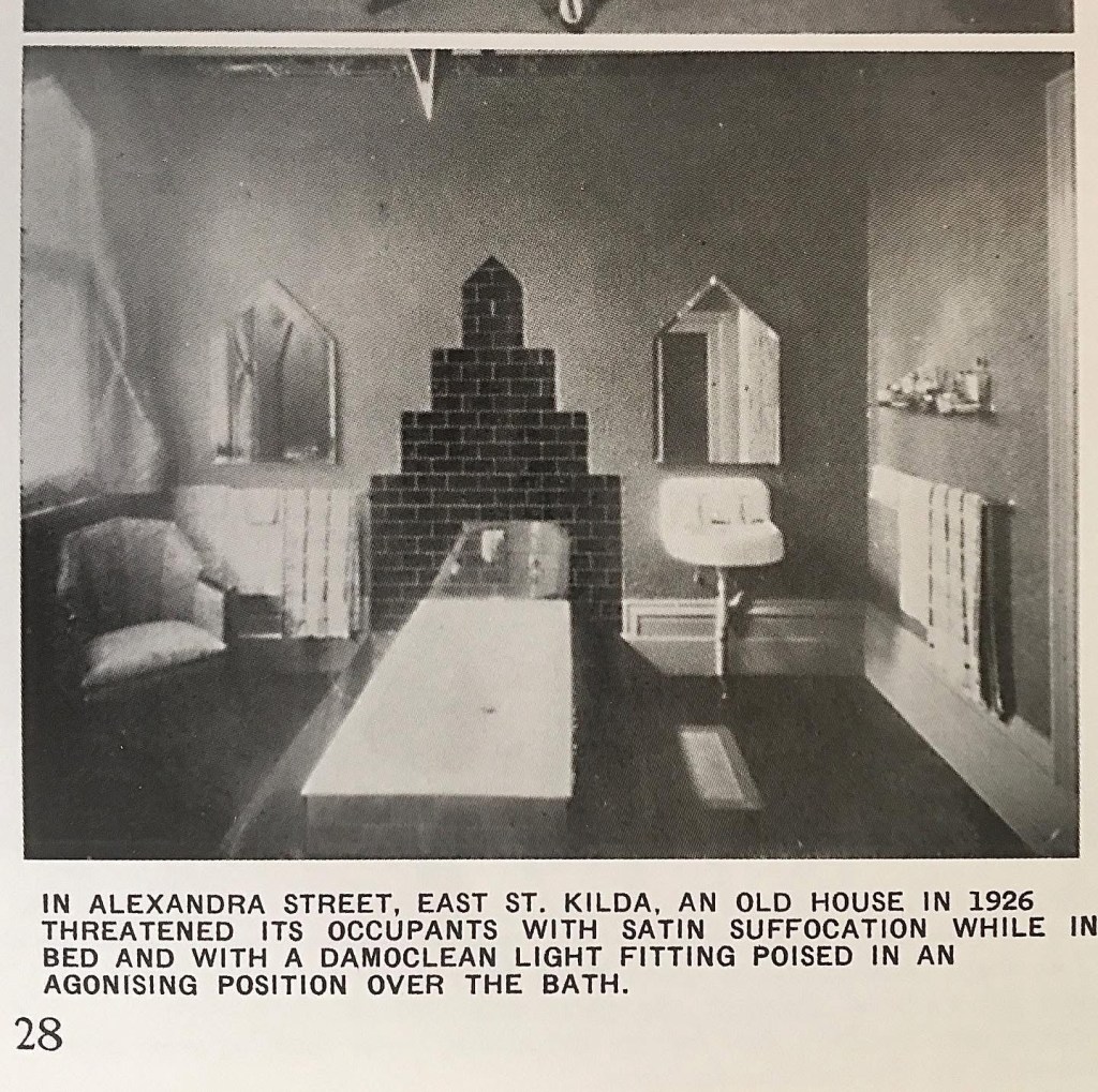 I went to a lecture a long time ago where it was proposed that Art Deco arrived in Melbourne in 1926 with this bathroom, just one year after the Exposition in Paris made the style famous. But all we have is this photo from Robin Boyd’s 1947 publication Victorian Modern, where he was quite disparaging (and it is bit of a naive attempt). It was in an ‘old house’ in Alexandra Street East St Kilda, so I’ve tried to work out where. I thought likely a big house, if they could afford to redo such a big bathroom, and there were only a couple of mansions in that street, and one is still there ! The Rabbinical College of Australia now occupies a big house built in 1884 as Holmwood, still pretty intact. It was owned from 1925 by Greek born Mareeno Lucas, who with his brother Anthony Lucas operated the famous Cafe Australia, re-designed by Walter & Marion Griffin in 1916, so he had a history of avant-guard design, and it’s the right date. But might have been a different house.