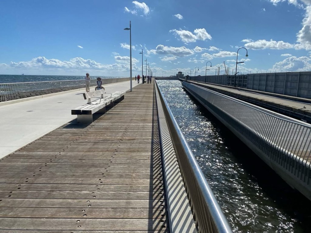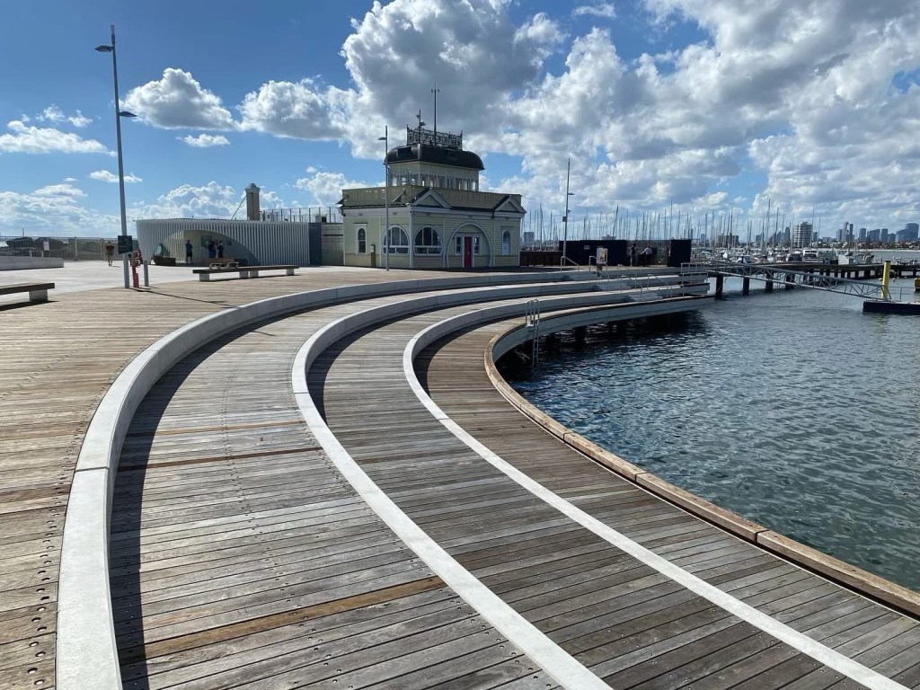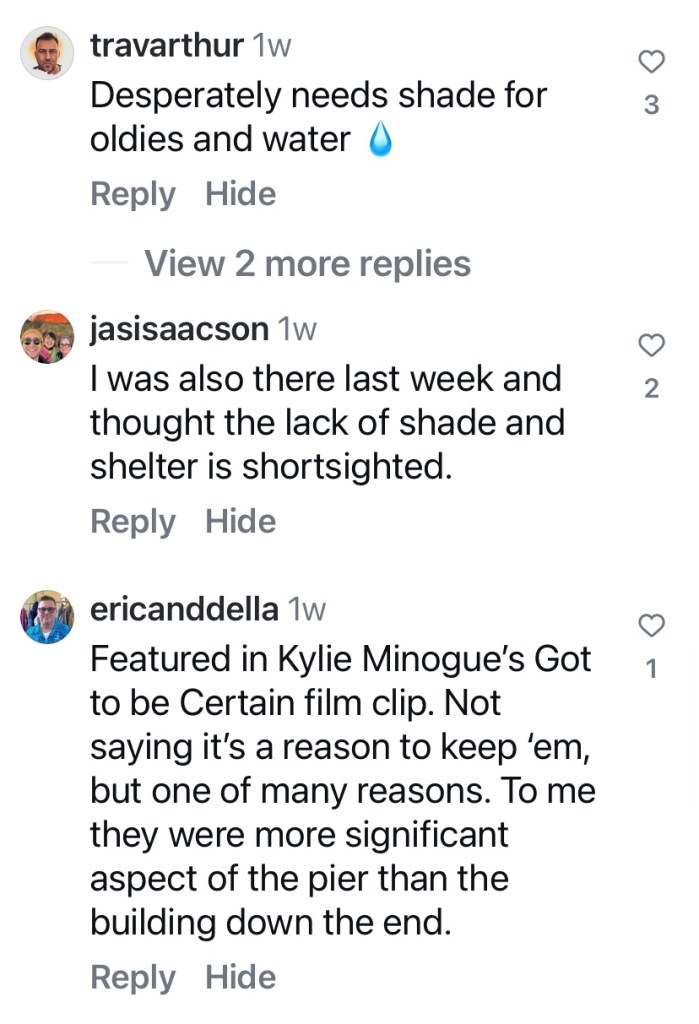 The new St Kilda Pier opened yesterday ! I quite like it. I was expecting lots of clunky concrete, and there is perhaps too much conc, but there’s lots of timber too, including seats, and the handrail is rather elegant. At the kiosk end it curves around, following the existing breakwater, and steps down to get you closer to the water, which is nice, also a bit sheltered, perfect weather yesterday. Interestingly hardly anybody sat there, think most people just like promenading. So the pier ends up on a different alignment to the previous one, but the one before that was a bit to the left (last pic c1915), and there’s a short piece on the old angle, and lower down for boats to moor. Looking back it still aims straight for the Esplanade Hotel. There’s a curious circular info kiosk/shade thing, and beyond that there’s a windy boardwalk for penguin viewing, but I was running out of puff by then (they were going to charge for that bit but too much backlash). Back on land, there’s a nice new grassy mound. The pier was designed by @jcbarchitects, who did the boardwalk 15 years ago, which also has timber, but is actually a different aesthetic, but I guess never mind, the foreshore is a jumble of periods. Last note, I still can’t understand how the old pier was at the end of its life, being concrete 1970s, I’m sure there are timber piers much older than that. The new one has steel piles, or rather steel tubes filled with concrete, and has a design life of 50 years. They havnt fully demolished the old pier yet, with its pseudo Victorian shelters, 2nd last pic.