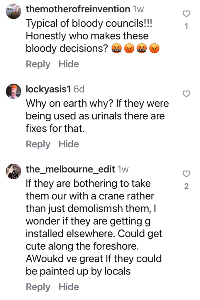 Say goodbye to the Victorian style shelters from the old St Kilda Pier ! Just happened to be on the spot. I’ve heard them described as ‘iconic’ (not by me), and they feature in some postcard type photos eg 2,3. They’re not that old, well I suppose 40 years old now, but not historic. They did however proved a sheltered place to rest if the walk down the pier was too hot or too windy, and I think the pier could have done with some shade somewhere. The beach too.