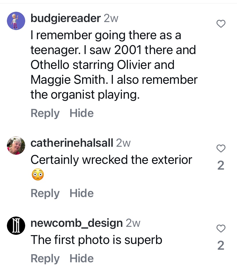 There’s so many long lost interwar cinemas, but here’s one that’s still a cinema but sadly nothing original left – the Dendy Brighton was built in 1940, and designed by Cowper Murphy Appleford in a rather bitsy Art Deco style, with two tone bricks and a sign that went up out and back again. The auditorium by contrast had curvy speed lines, peppered with giant plaster flower/light fittings, rather odd but fun. It all seems to have survived until 1984, when the auditorium was made into two, and the facade altered/covered. In 2000, it was enlarged to 5 screens, and has just been done over, adding another one. The other point of interest is that the big Wurlitzer pipe organ from the 1924 Capitol Theatre in Swanston Street was saved by the theatre organ enthusiasts and relocated here in 1967 when the Capitol was reduced in size; its now in pieces I think waiting for funds so it can go back to its original home. All photos found on facebook.