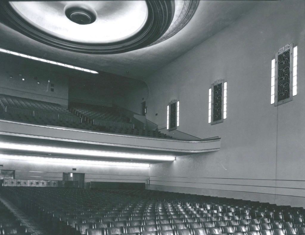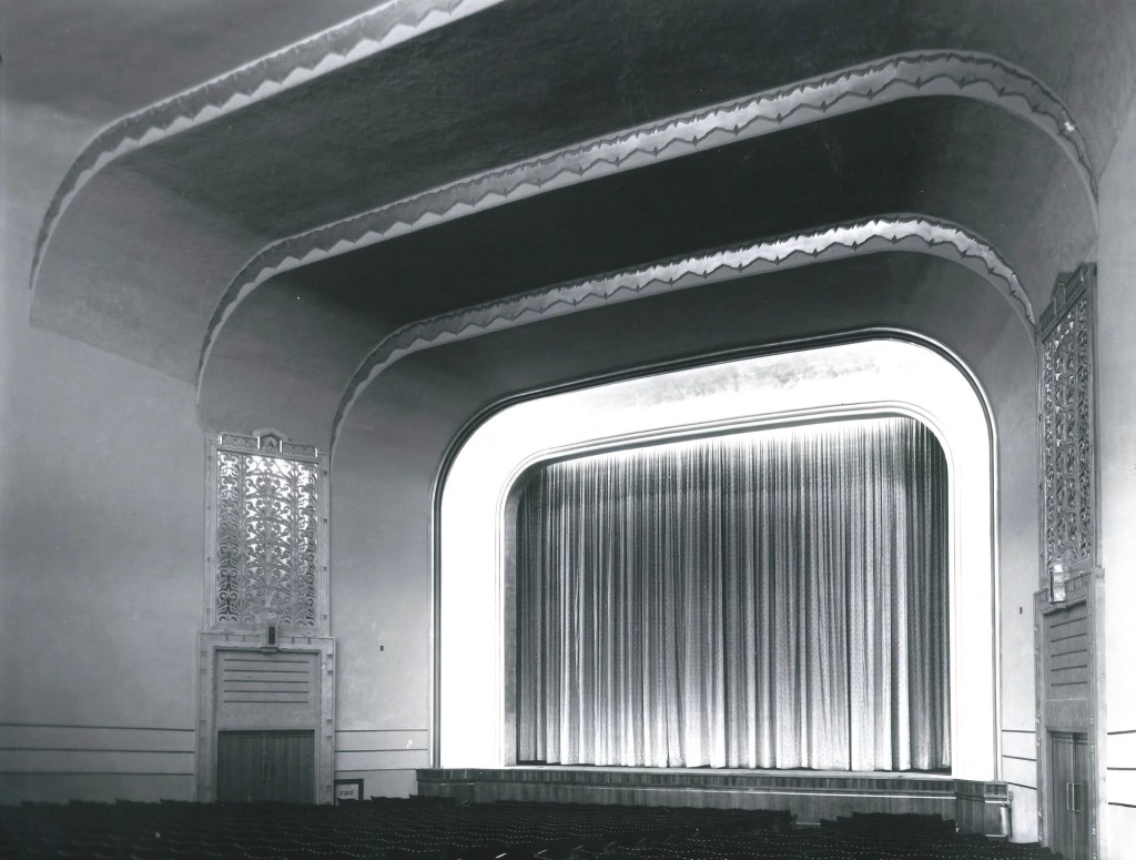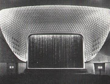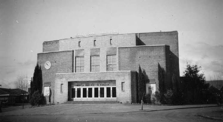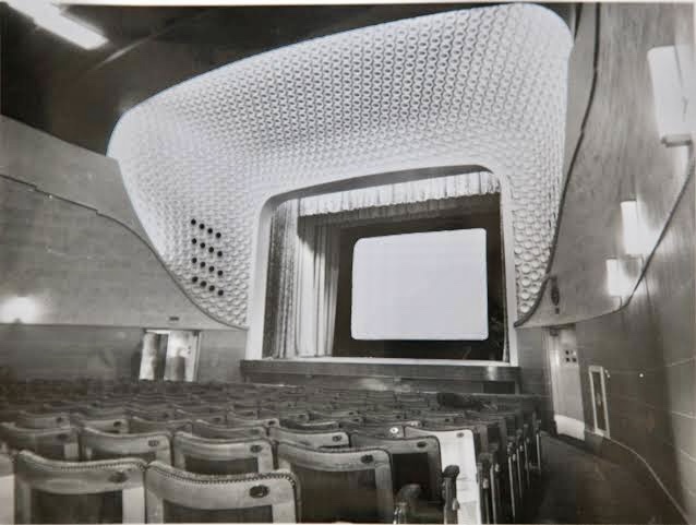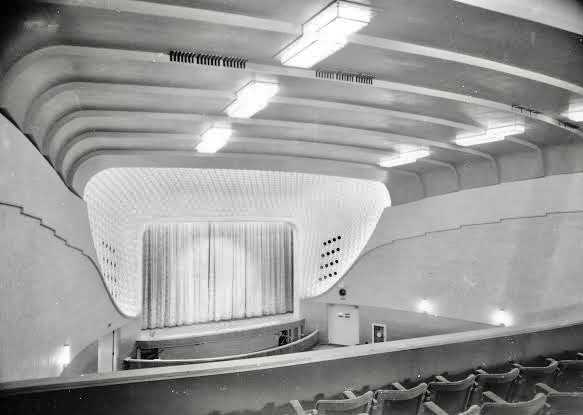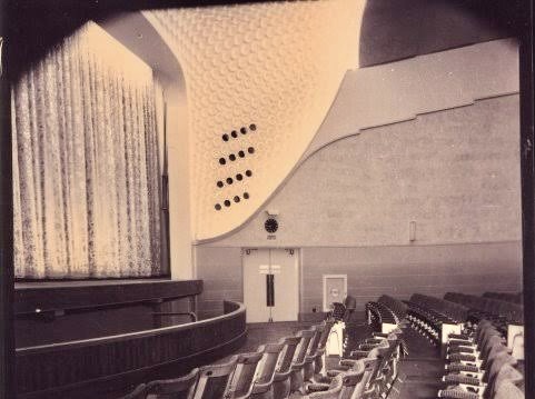 Not Melbourne and long gone, but quite outstanding – the Yallourn Theatre, opened in 1939, closed in 1978, and demolished along with the whole town in the early 1980s. It was designed by cinema specialists Taylor & Soilleaux, who also brought us the Rivoli, with SEC architect William Gower. The various rounded elements of the auditorium made it much more interesting than the applied Deco features of most other cinemas, closer to German Expressionism, almost. The proscenium area was highlighted by plaster circles, lit from the sides, pretty groovy. It was all rounded to provide ‘perfect acoustics’ and the ceiling shaded from blue-green at the front to light green to the rear. The theatre was more like a public building, located in the middle of town, and designed for live performances, meetings, and concerts, with a wide curved frontage looking rather grand. I still puzzle about the whole idea of building a town that was just going to be demolished eventually for enlarging the coal mine – why not build it a bit further away ? Maybe they actually walked to work. All photos via various Facebook groups. This post prompted by an article on Yallourn in the latest Art Deco & Modernism Society magazine by Robin Grow.