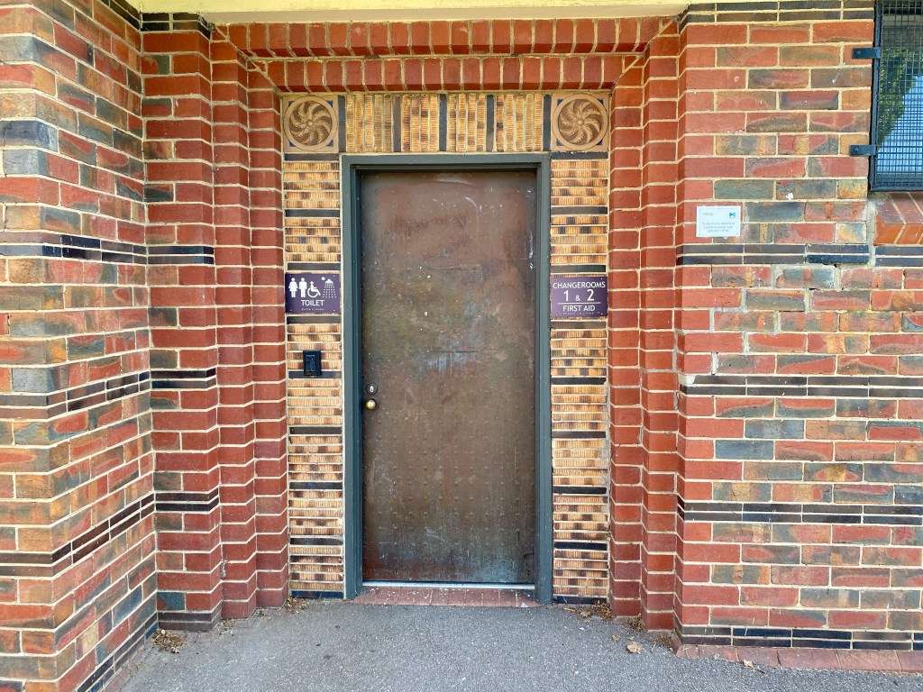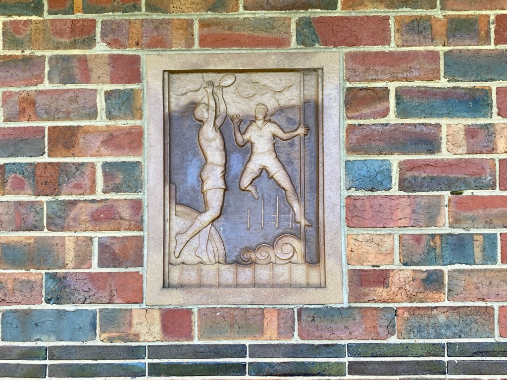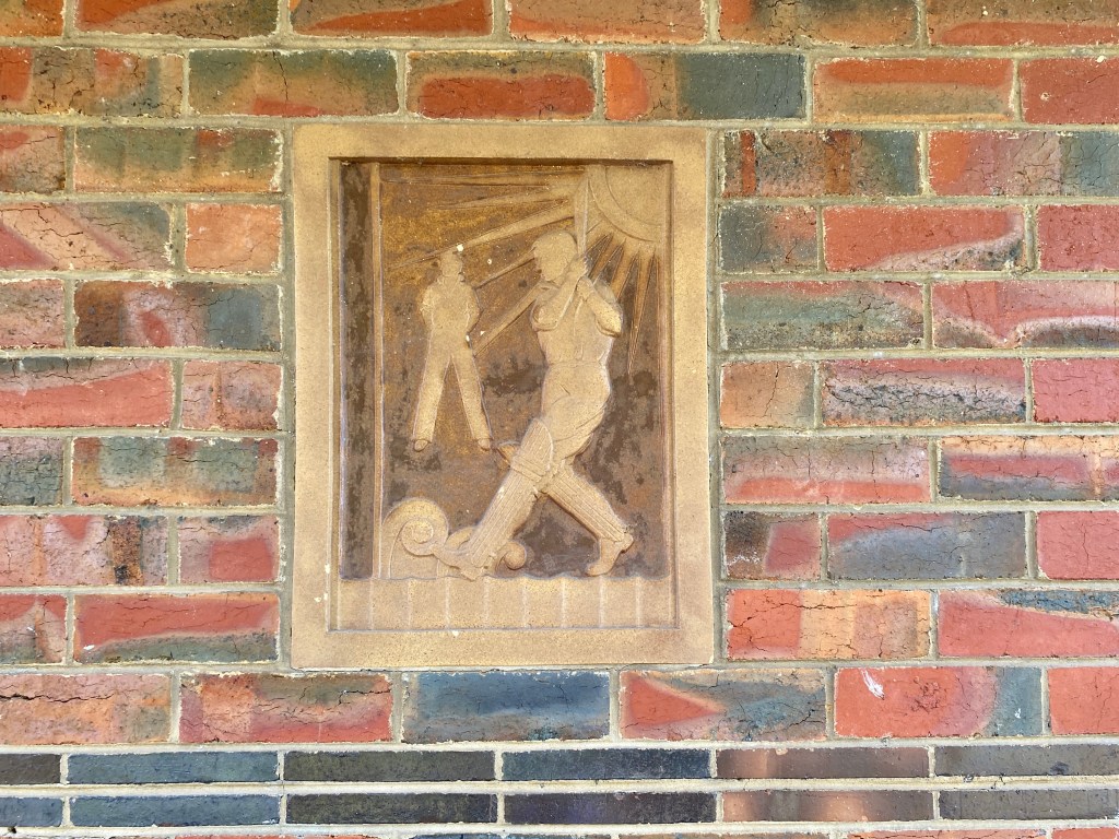 The very stylish changing pavilion in Fawkner Park was built in 1937, designed by the ‘city architect’ of the City of Melbourne. Fabulous brickwork wrapping round each of the many doors that provided facilities for a variety of sports in what’s quite a large building. I spotted some nice terracotta panels depicting sports but got disappointed when I realised they repeated, only depicting cricket and … volleyball ? Oh it’s a footballer doing a flying mark! The facilities made the news in 1936 for providing for ‘women athletes’ as well as men, though there’s only men in the panels. There’s a second matching one further north, though the courtyard has been filled in, and this one has a separate matching toilet block, now storerooms.