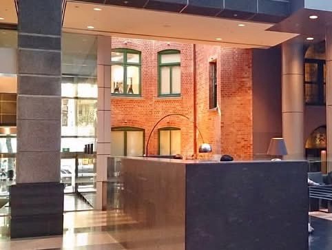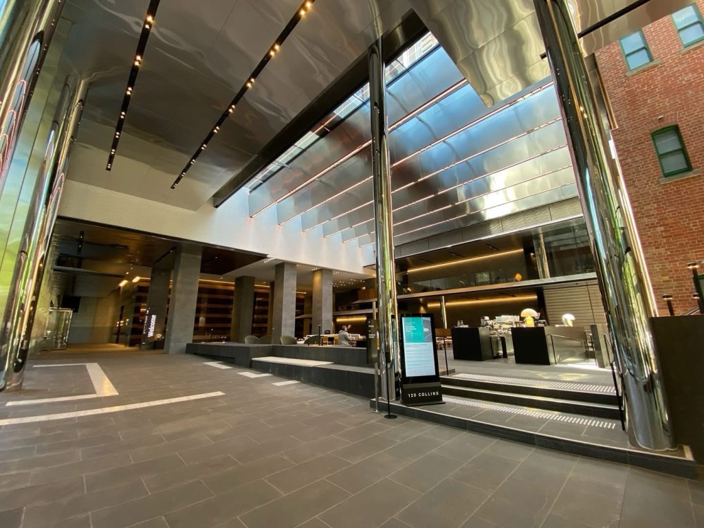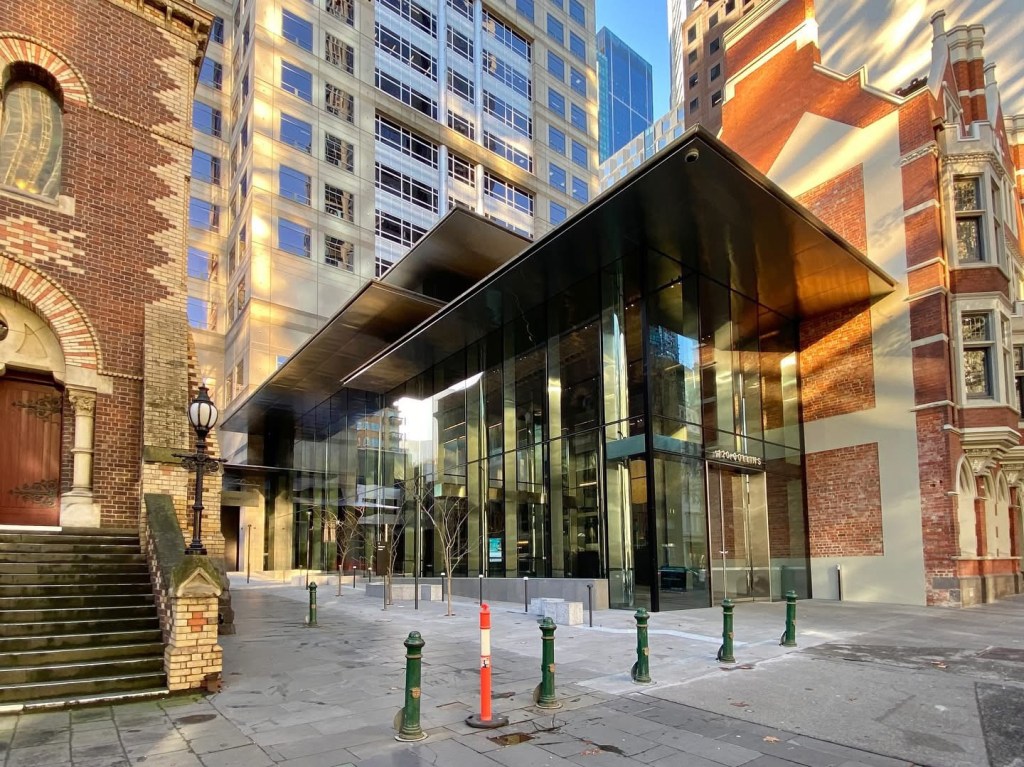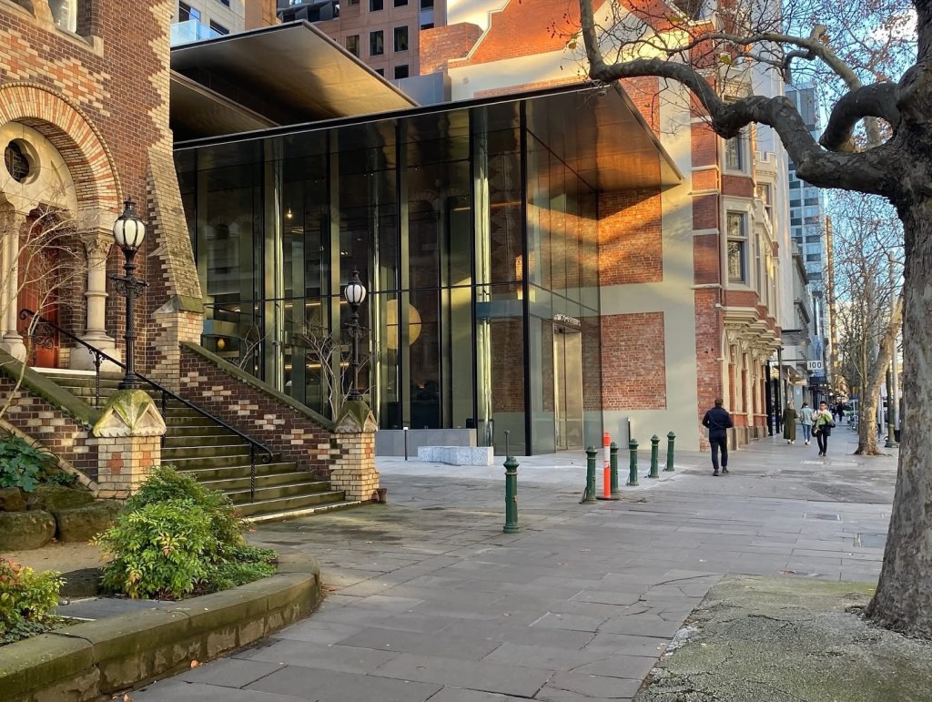 The new refurb of 120 Collins Street by @hassell_studio includes a new glass entrance, which is nicer than the stripey lumpy grey it was before, but I think that sharp roof introduces a discordant note on Collins Street. And it wasn’t necessarily a good idea to reveal side wall that was never meant to be seen. But it is admittedly hard to create something that would fit perfectly, right next to the robust 1867 polychrome brickwork of St Michael’s. There was another even blockier entrance, now a shop, a much better idea. Before pics are streetview, 2019. Inside, they’ve opened out the space behind the 1908 Professional Chambers frontage, making a feature of it, rather than half hidden like before (pic 6 is 2015). And of course there’s a cafe. They’ve left the original 1991 strident polished granite cladding to the lift core though, which I quite like. That and the tower are by Daryl Jackson, not his best work.