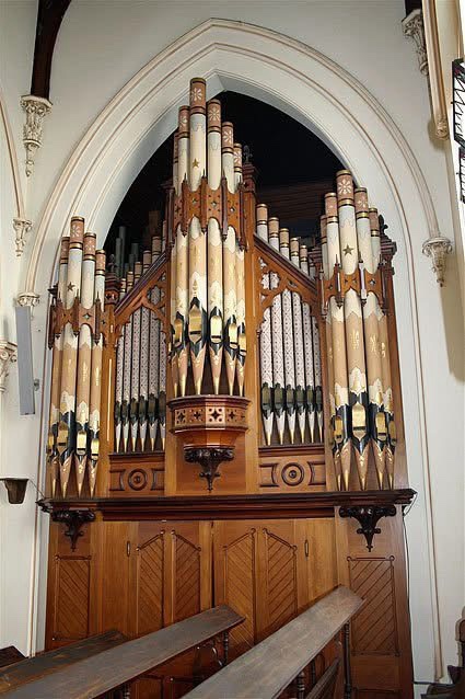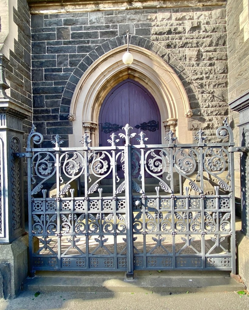 The Presbyterian Church on Barkly Street St Kilda has dominated the hill since 1885, and just sold after only 2 weeks on the market. It’s got so little land, no room for underground parking for instance, so perhaps it was another denomination, or going to be a large house ? It was designed by John Beswicke, who was very prolific, but didn’t do many churches, and it’s actually a curious bit of Gothic – rather spiky (which I like), but the details are all rounded, the curves of the window tops are just round instead of proper quatrefoil, and the crockets are like little spheres when they should be like little fern fronds. The cast iron is good though, much more frondy, and it’s certainly a landmark, the spire is in line with Punt Road way to the north. I’ve not been inside, but it looks tall and airy, at least with the lights on. There’s some fine stained glass and a notable Fincham & Hobday organ from 1897 too. The church is listed by Port Phillip, and with interior controls ! Not at all specific though. Exterior pics mine, interior from the real estate ads and Facebook.