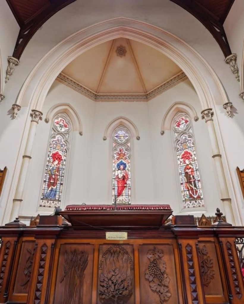 The liturgical east end stained glass depicting Faith, Hope & Charity with the Burning Bush (the Presbyterian motto) is by Ferguson & Urie, as are the plain lead lights with stained glass borders at the west end. Other windows are from the studios of Napier Waller, Matheson & Gibson, E. R. Shuffling (London), and Brooks Robinson & Co.