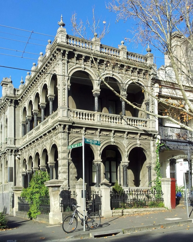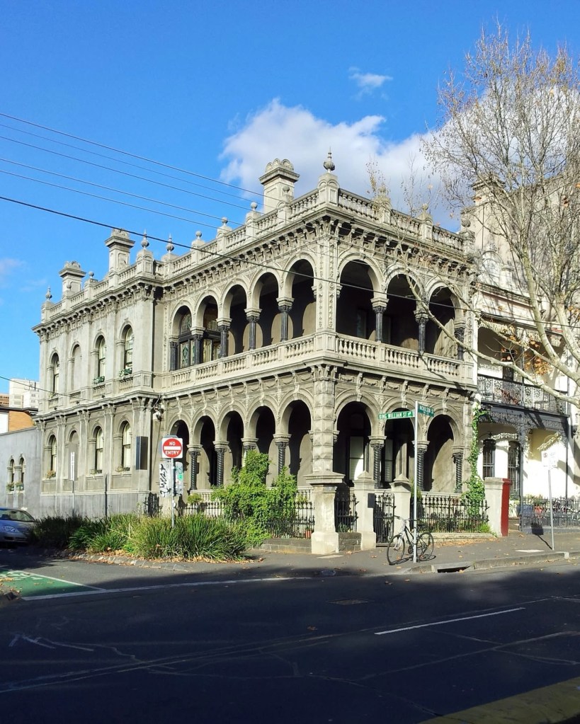This extravaganza of High Victorian stucco makes quite a statement, but oddly nobody knows much about its creation. It sits boldly on the corner Nicholson Street and King William in Fitzroy, near the Exhibition Buildings, and I took the pics in 2014.
