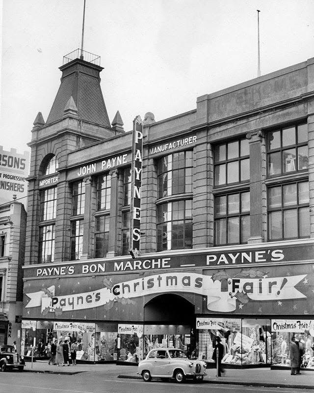 The Herald’s Instagram account, @heraldsunphoto_retro, is all great Melbourne stuff from the 30s-60s; I’d heard about the Payne’s Bon Marche department store in Bourke Street but never seen a photo or knew where it was exactly. This photo is Christmas 1955, and I worked out it’s where the 1969 Hoyts Cinema Centre is now, and there’s two matching bays beyond the photo to the right that are still there, with an extra floor. Then I found an earlier pic without those four bays from @unilibrary, and the information that it was originally built in 1909, and designed by Tompkins & Tompkins, a more classical design direction from them having just done Dimmeys. Don’t know who did the extension or when. Le Bon Marche is a department store in Paris, reputedly the oldest in the world, beginning in 1838 (though the building is 1869).