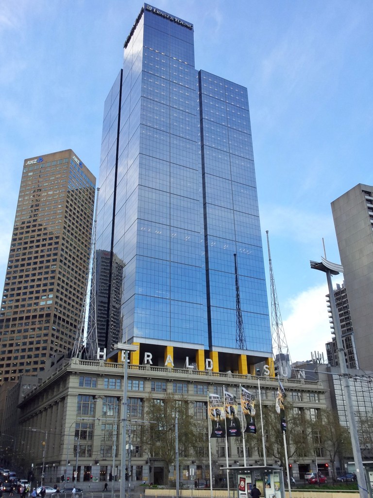 I don’t mind the end result of the redevelopment of the Herald building in Flinders Street from 2005 – about 20m deep of the original 1920s building was retained, so the tower rises up well behind, you don’t notice it from the street. Another fun bit is that you can walk through it, and admire the giant columns, in bright yellow, a signature colour of the architects @dentoncorkermarshall at the time (also seen on the big cheesestick, but super faded on the carpark building I posted recently). The tower isn’t the best of their work, somewhat modelled into four towers, but just a glass box really. The original design in 2001 was circular but the site was sold to a more conservative client who wanted corner windows (I was told!). The only interior that might have been kept were the timber panelled main offices, but I think they took the panelling before it was listed. I also recall Heritage Victoria didn’t want to see so much demolished, pretty unusual for them then to say no, considering in other cases they’ve let only a facade be retained, but the permit process was complicated, and somehow VCAT overruled them, that can’t be right….? First photo 2013, rest last week.