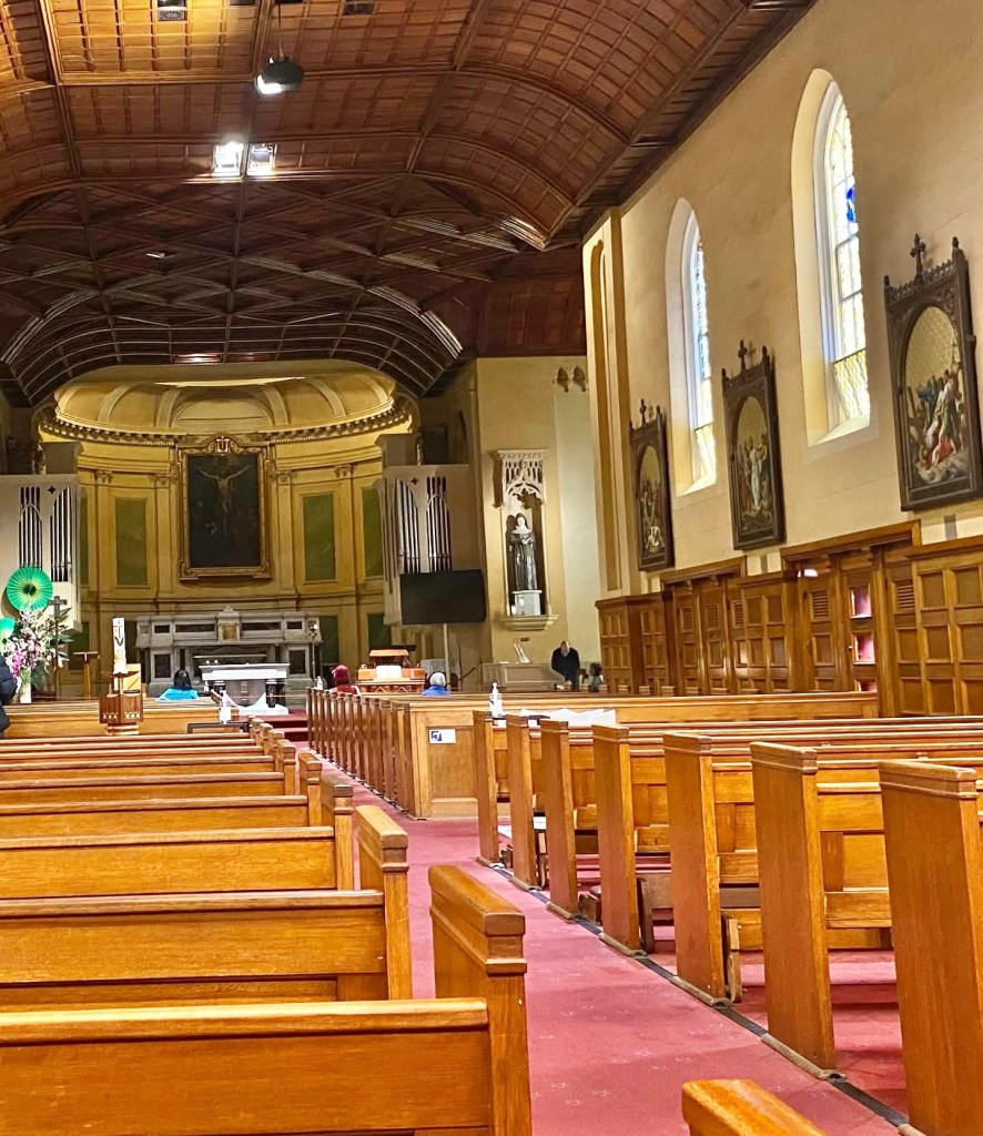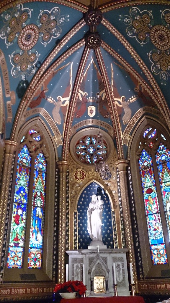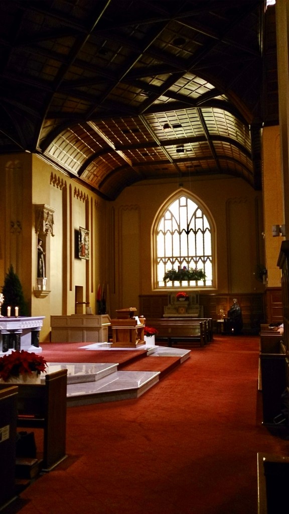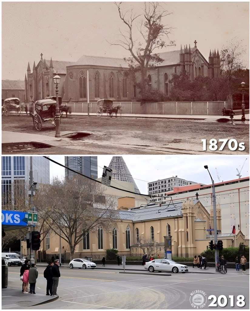Repost from 10 years ago : St Francis in Elizabeth Street is an amalgam of many periods and changes, with the main middle section built 1841-5, making it one of the oldest buildings in Melbourne. The first thing you see going in is a huge marble #baldaccino thing – it was originally part of the large elaborate marble altar imported about 1878 from Rome (of course), to go in the new extended classical style apse, even though this blocked the big crucifixion painting from view a bit. So over 100 years later in the 1990s they got a permit to move it here into the #narthex (itself added in the 1950s), to use as a #font, but that didn’t happen it seems. I could only find one pic of it in the altar, almost lost in various decorations. The older part, designed by Samuel Jackson, is very restrained, very Colonial, with simple Gothic windows and an un-gothic lovely flat panelled cedar ceiling, installed in 1850. Off to one side is the 1858 Ladye Chapel, its elaborate vaulting and polychrome decoration a big contrast to the nave. Pic 4 and the comparison image borrowed from Facebook.