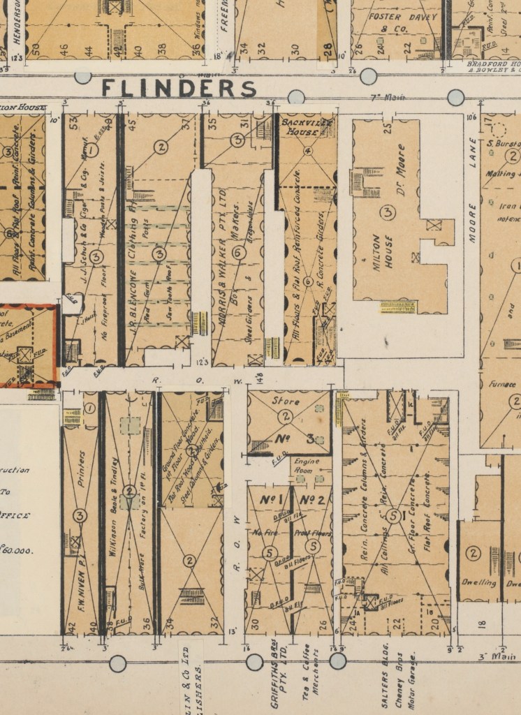 I now realise I was working from a memory probably from the 90s, before the Herald building tower, and before the 1996 carpark building that’s now being replaced, when there might have been some timber stairs here – but it was never like the photo – which is actually the back of Robbs Building (Robbs Lane) that once stood on the corner of Collins & King, demolished in 1982. And the photo is from 1956, found in the 1994 book about Melbourne’s lanes ‘Essential but Unplanned’.
