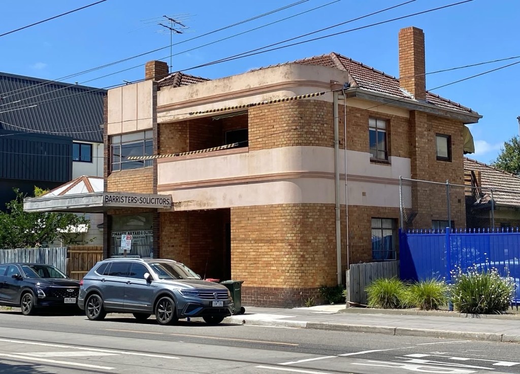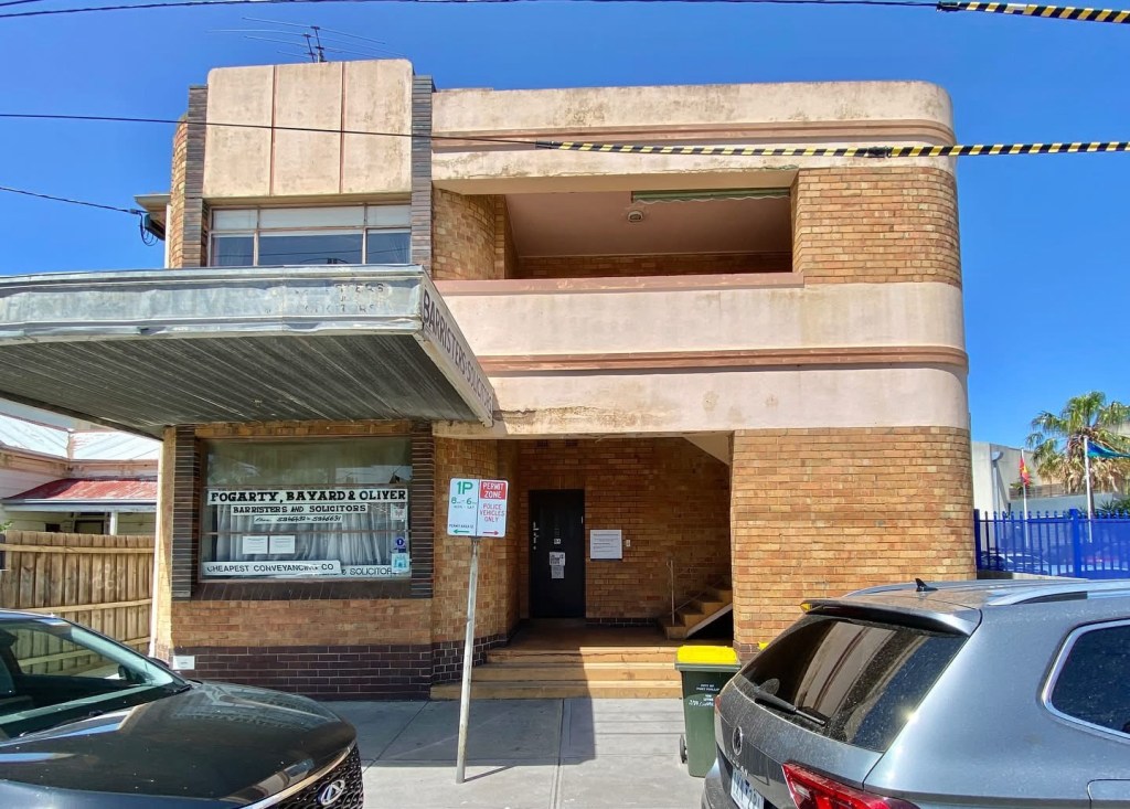 Cute but careworn Deco thing at the bottom of Chapel Street near Carlisle. Unusual in that it looks like it was built as an office with a flat or flats above and behind. It also sticks out because there’s a big carpark next door. The office is a lawyers with an old hand painted sign for Fogarty Oliver & Rothschild, and they’re still there; it’s right next to the St Kilda Police Station, perhaps they get some business from that ? Earliest ad I can find is for a Joseph Lynch solicitor here in 1941, so perhaps it’s always been a lawyers, and was built in that year.