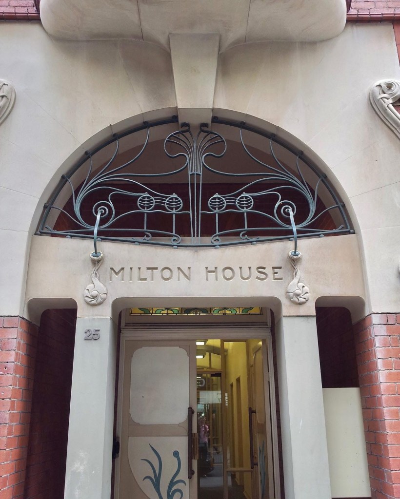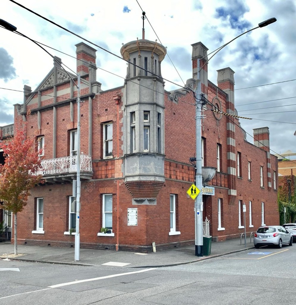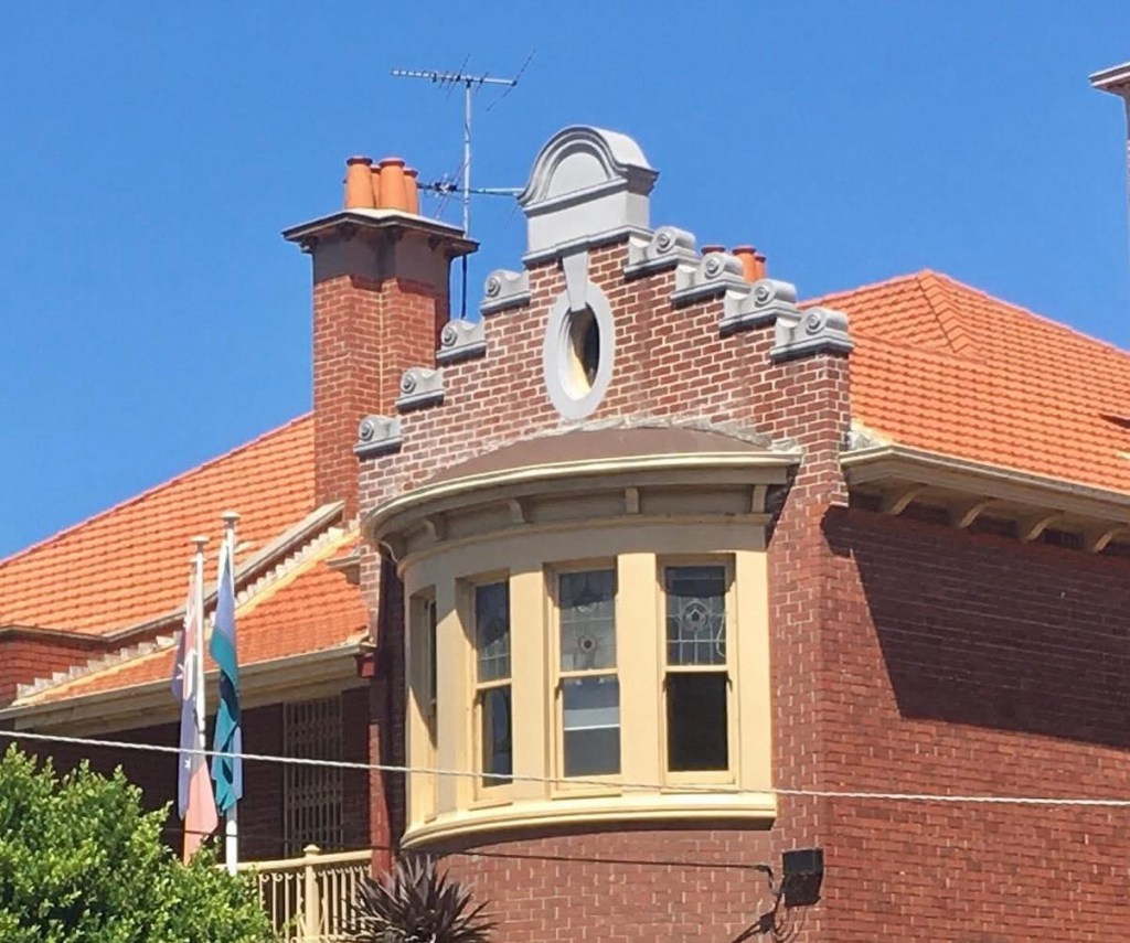 A rather unusual but fun parapet detail on 6-8 Fawkner Street St Kilda, which I’m told dates from 1901 and was designed by Sydney Smith & Ogg – but they often used the famous Arts & Crafts designer and teacher Robert Haddon, who sold designs to other architects. The very Art Nouveau tulip motif in the front gable is quite like Milton House in Flinders Lane, always said to be Haddon, and the stepped gable is like Eastbourne House in Wellington Parade, and like another house pair in Grey Street St Kilda thought to be by him, so let’s say here’s another ! Though not quite as nice. I can’t show you what these houses are like inside because I couldn’t find any sake or rental ads, and they’re a bit hidden by high fences.