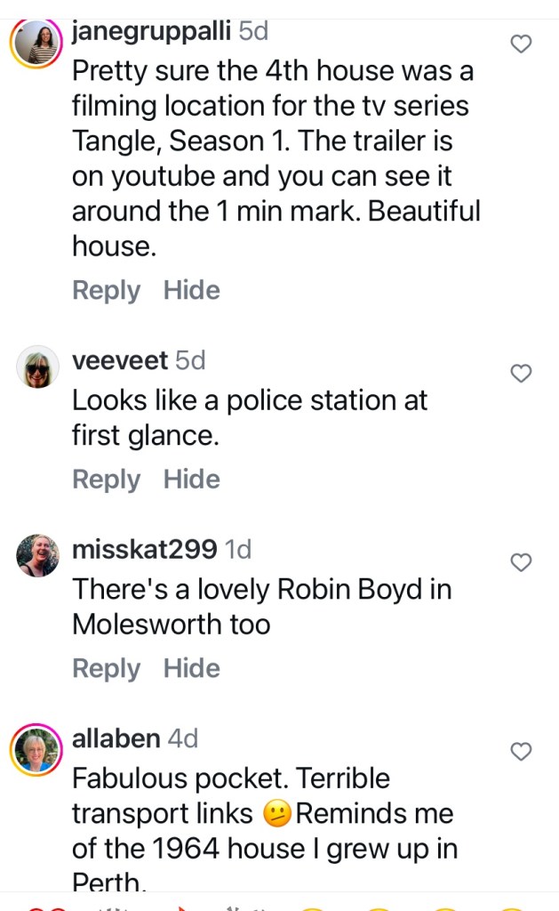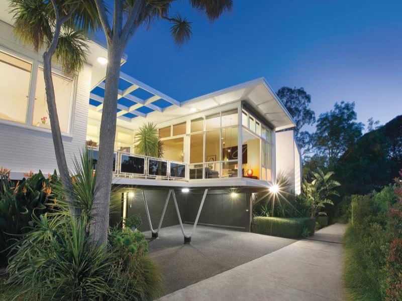 These ones are : 14 Carnsworth, by Geoffrey Danne, 1957; two in White Lodge Court, no dates or architects, but love the Niemeyer forked support with matching shrub (update I’m told it was Drayton & Colman for Alex Tomkin); then the fab Guss House, McGlashan & Everist, 1964 (not my pic). Lastly, 31 Holroyd Street, Kurt Elsner, late 50s, with a jaunty metal zigzag support, which had already had an addition that you can’t see from the street, keeping it mostly intact (last pic real estate, 2013).